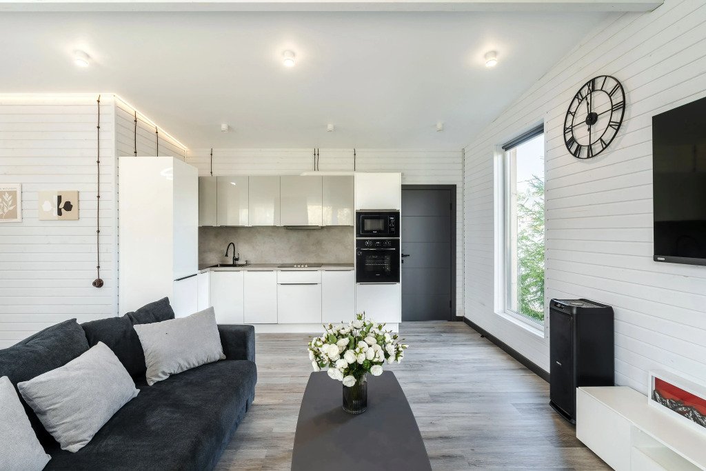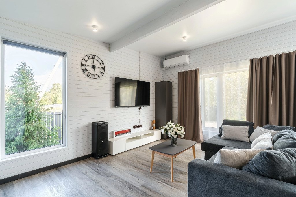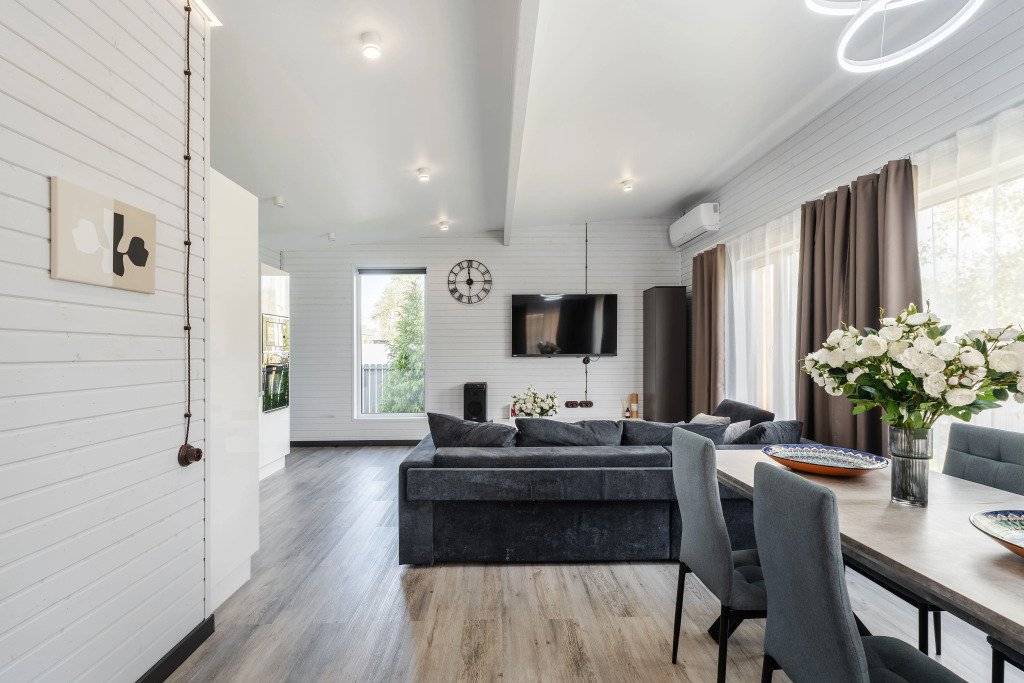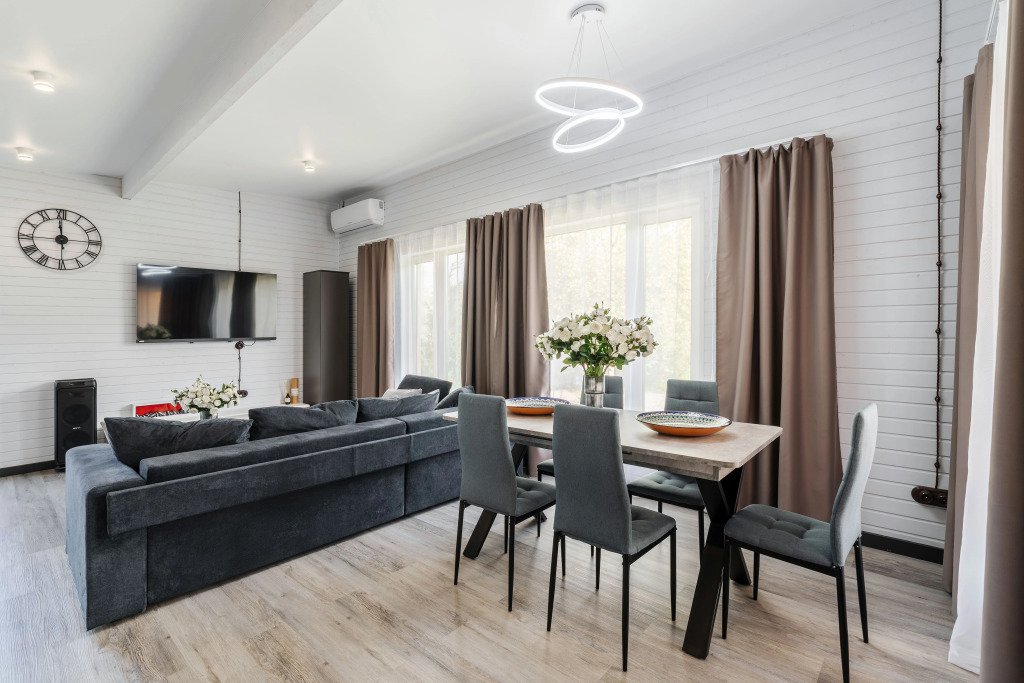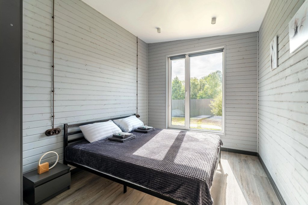 В доме: три спальни с кроватями 200х200 и двухместный диван в гостиной, шкафы с полками и вешалками, гостиная с кухней и обеденной зоной. Кондиционер.