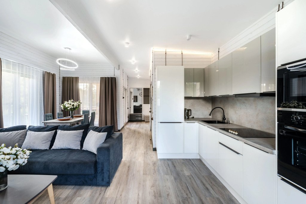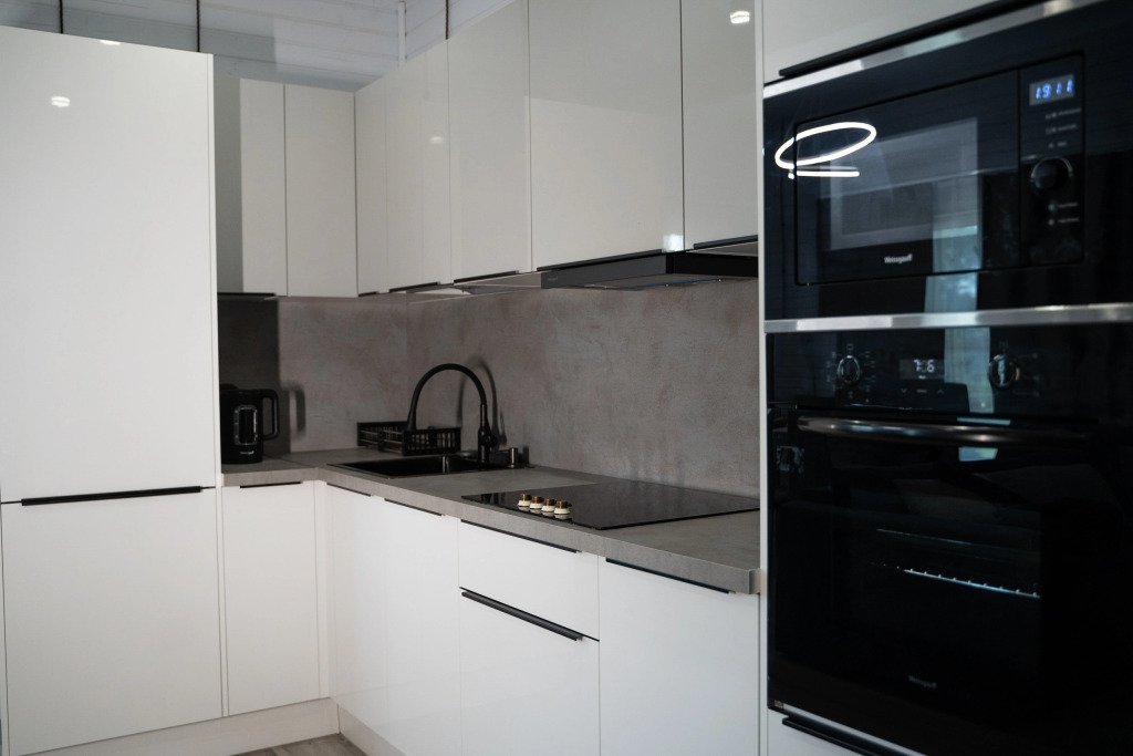 Кухня оборудована духовым шкафом, микроволновой печью, посудомоечной машиной, холодильником, чайником, посудой и необходимой утварью для приготовления пищи.