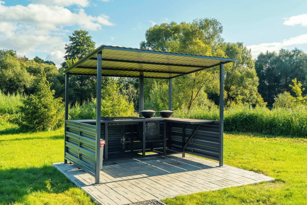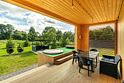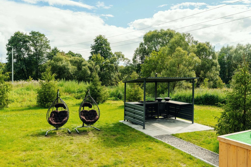 На территории: мангальная зона с принадлежностями, уголь предоставляется за дополнительную плату, бассейн, батут для детей, терраса c двумя чанами холодная и горячая вода, диван, два стола и 6 стульев.