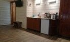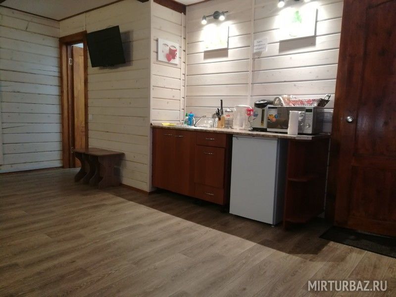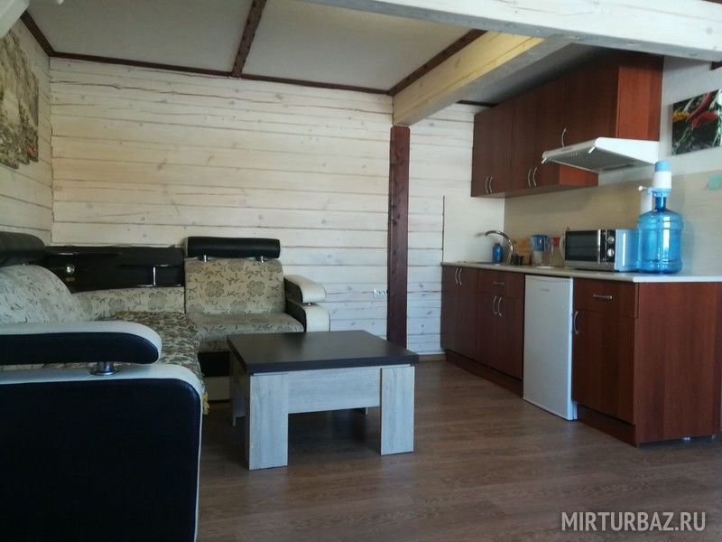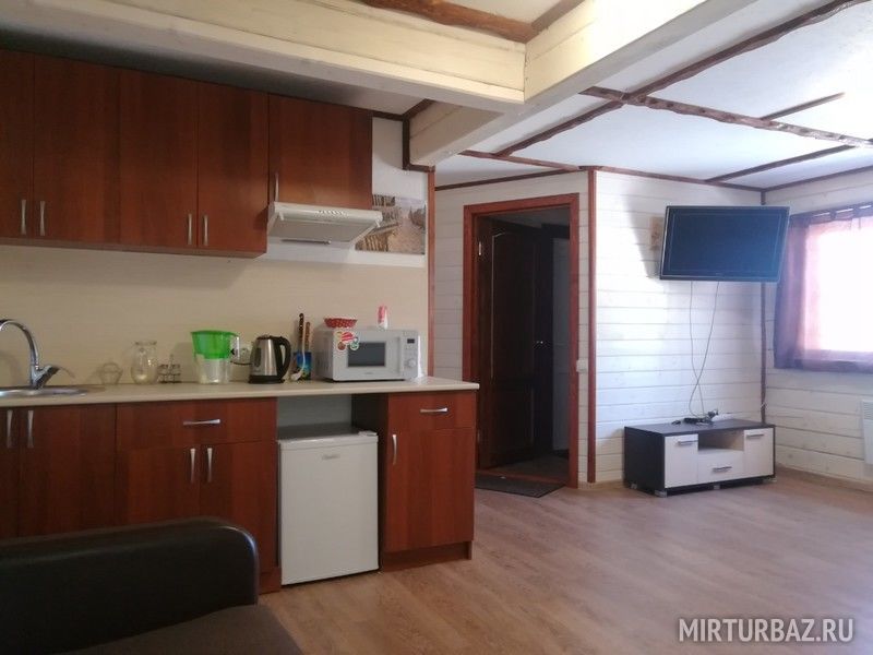 Кухня-гостиная оборудована всем необходимым: обеденный стол, холодильник, плита, микроволновая печь, электрический чайник, диван, телевизор, мангальная площадка.