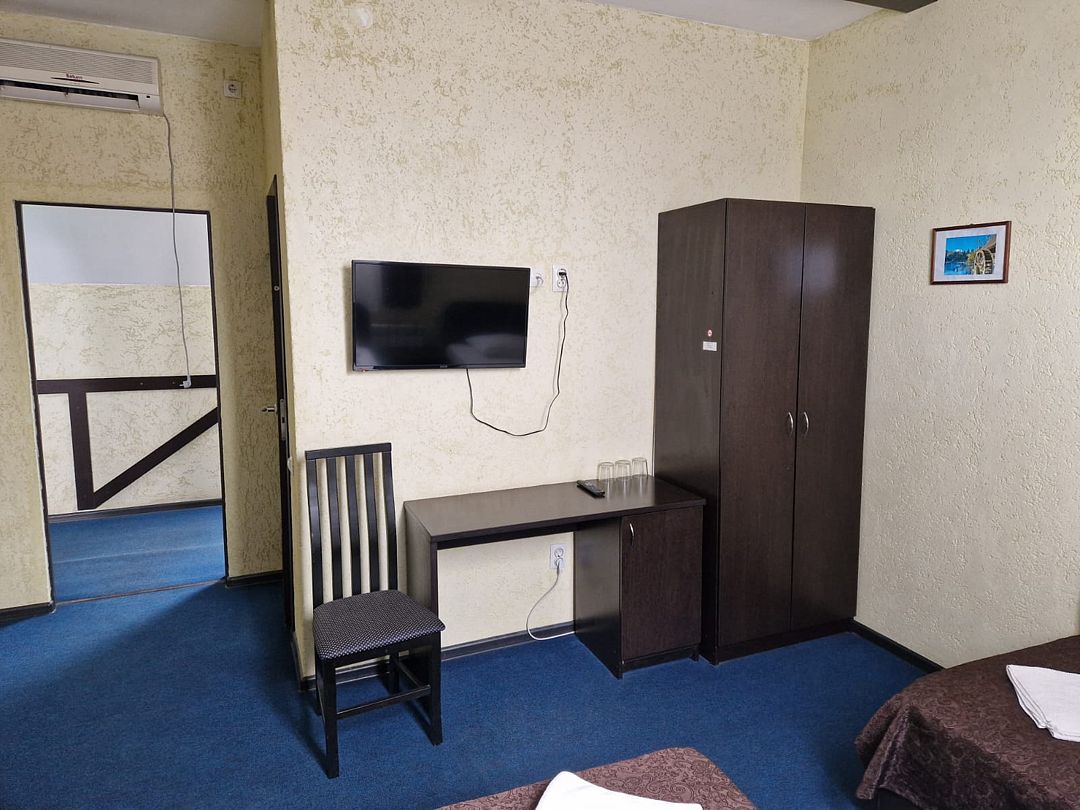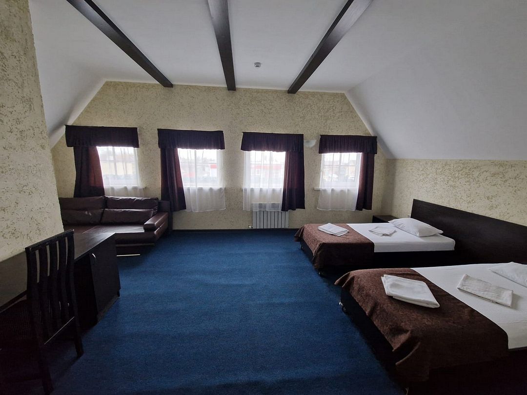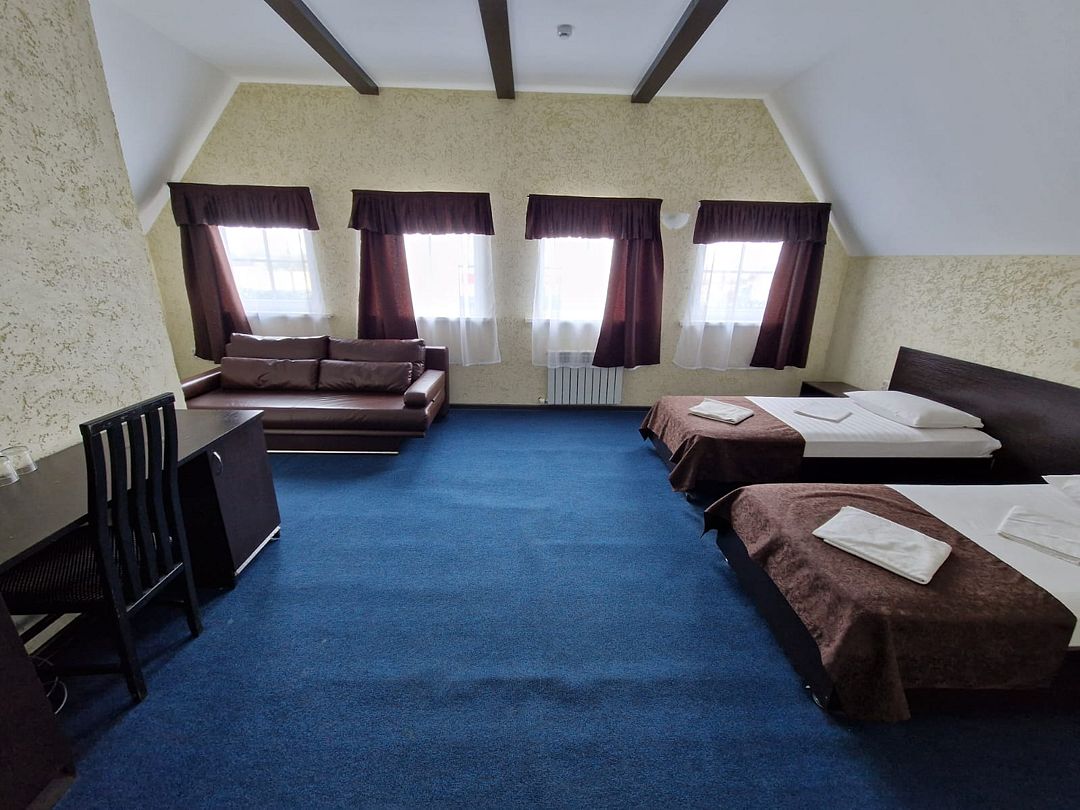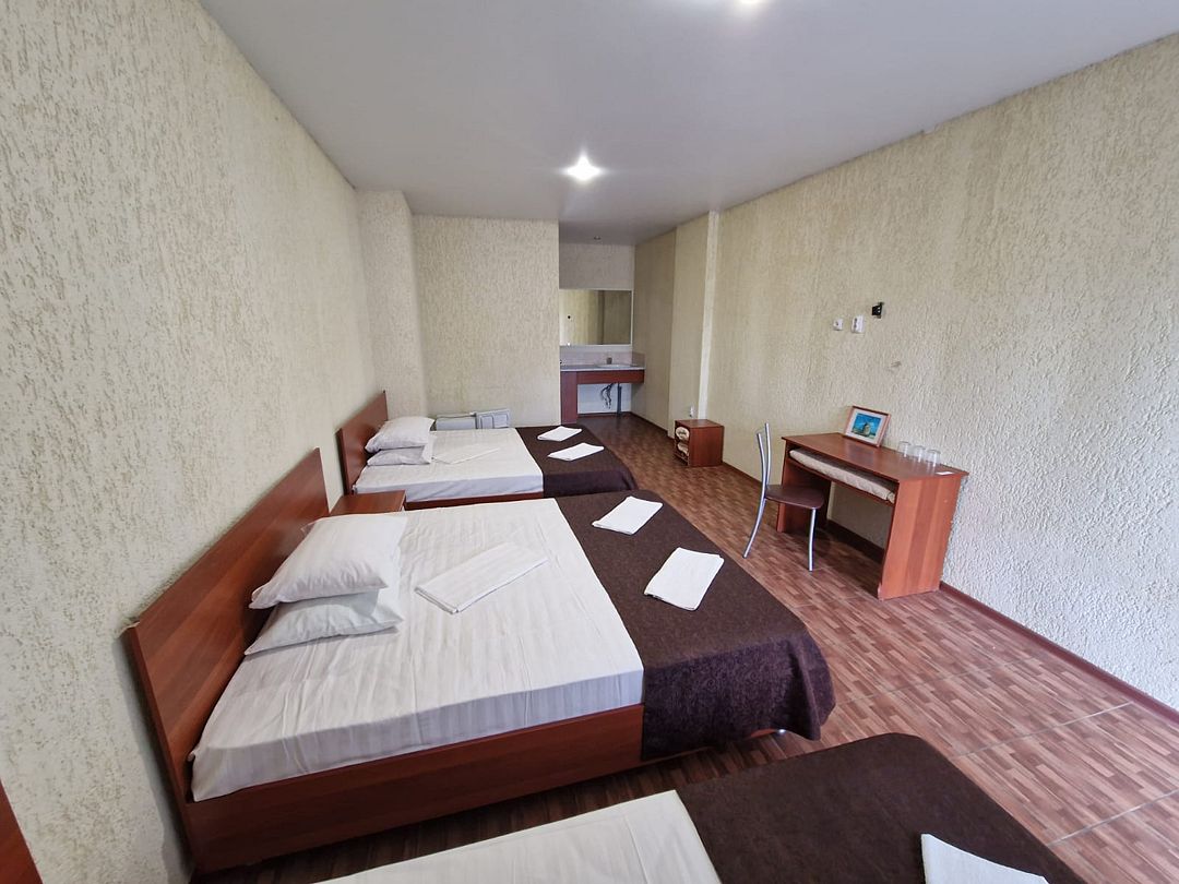 В номере 1 односпальная кровать, 2 двуспальная кровать, телевизор, сплит-система, отопление, стол и стулья, шкаф, постельное белье. Ванная комната: душ, туалет, туалетные принадлежности, фен. Общая кухня. Бесплатный wi-fi на всей территории.В гостиничном номере