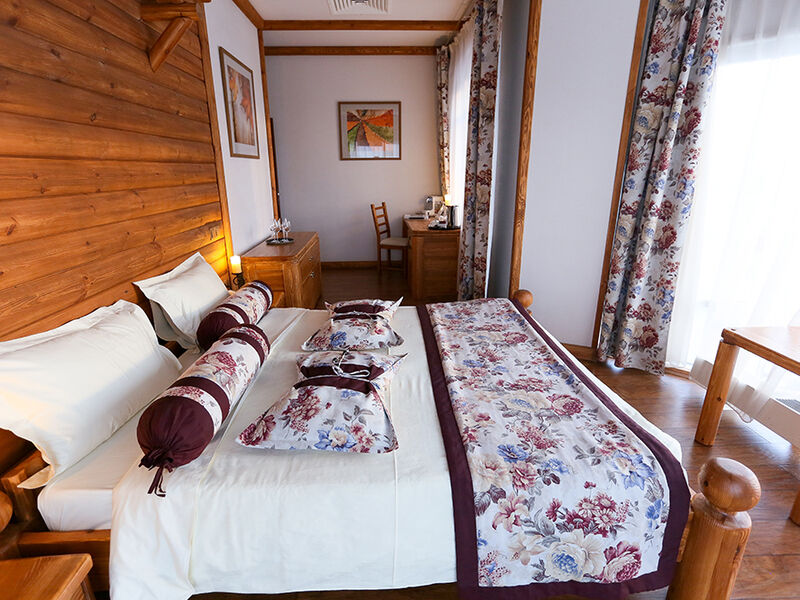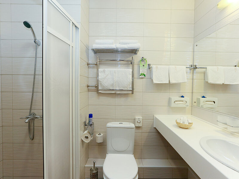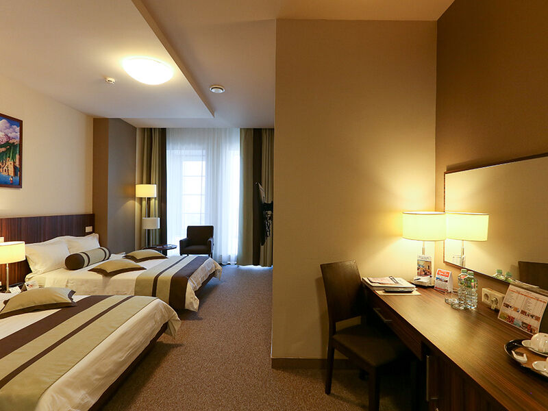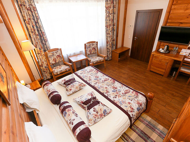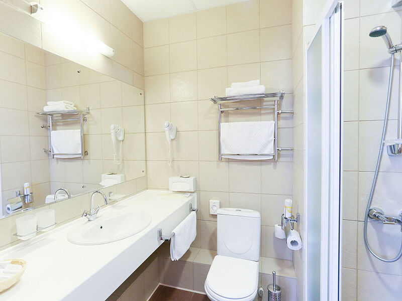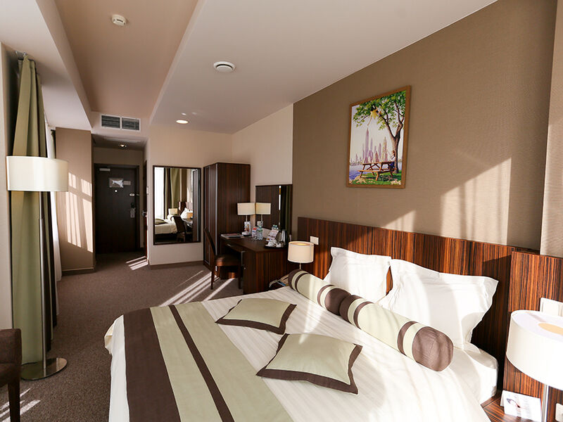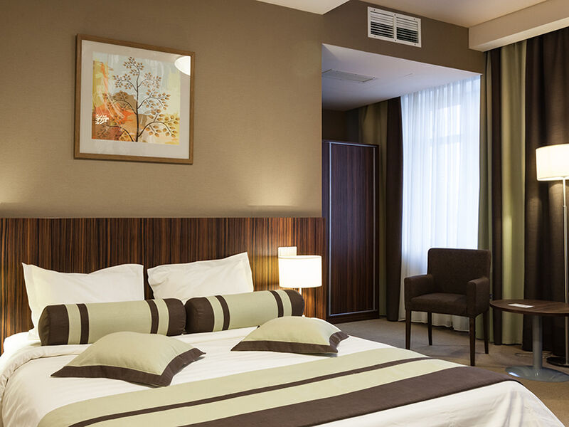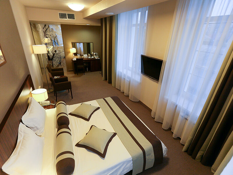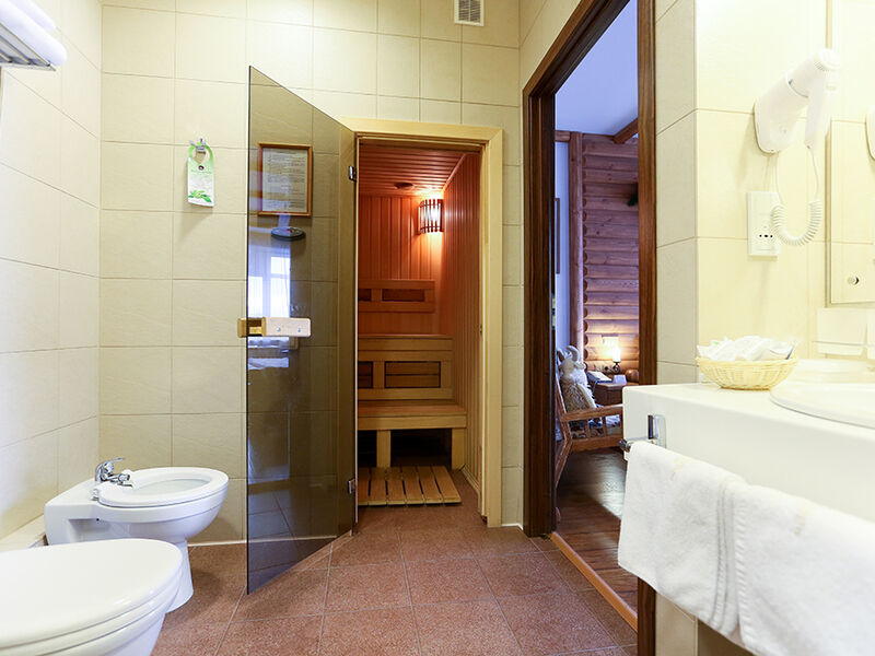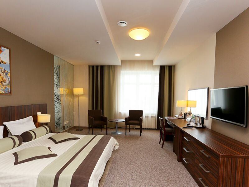 Номера хорошо меблированы, оснащены бытовой техникой, интерьеры выдержаны в классической цветовой гамме. В каждом есть ванная комната с душевой кабиной, а в номерах Люкс — собственная сауна.