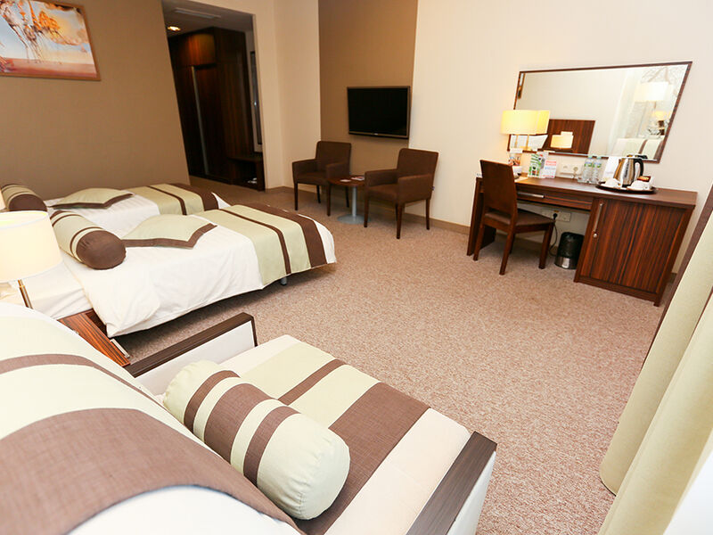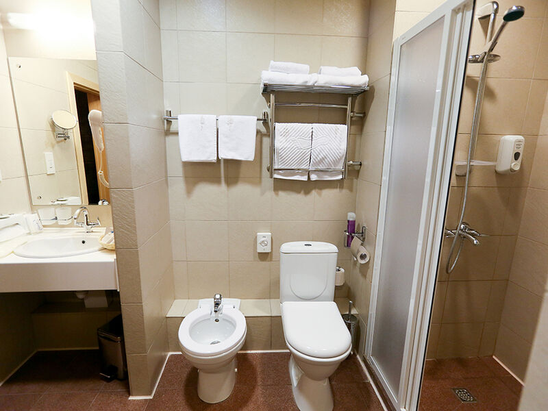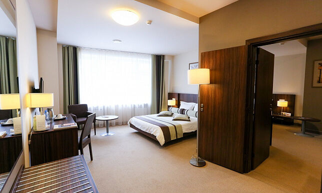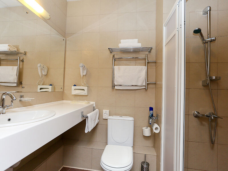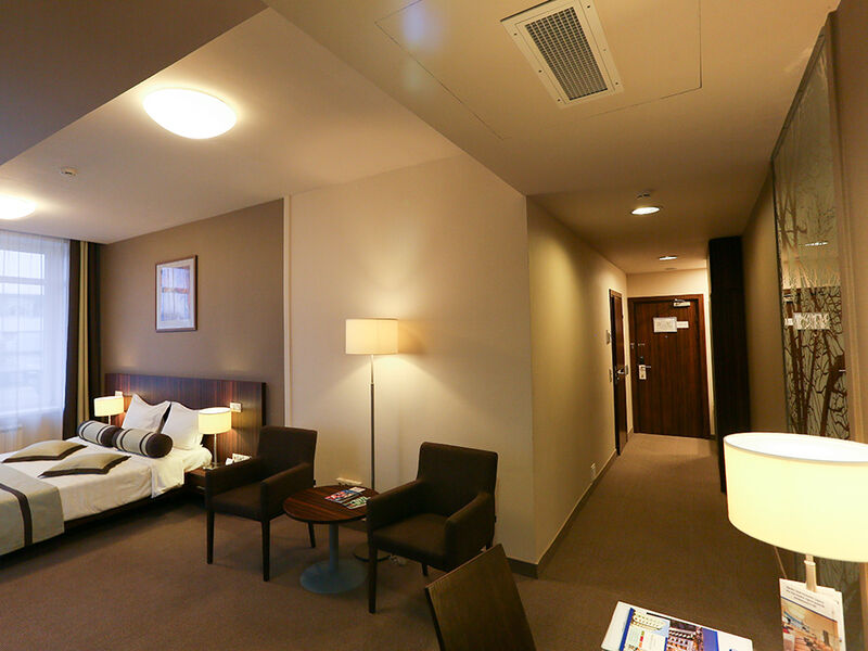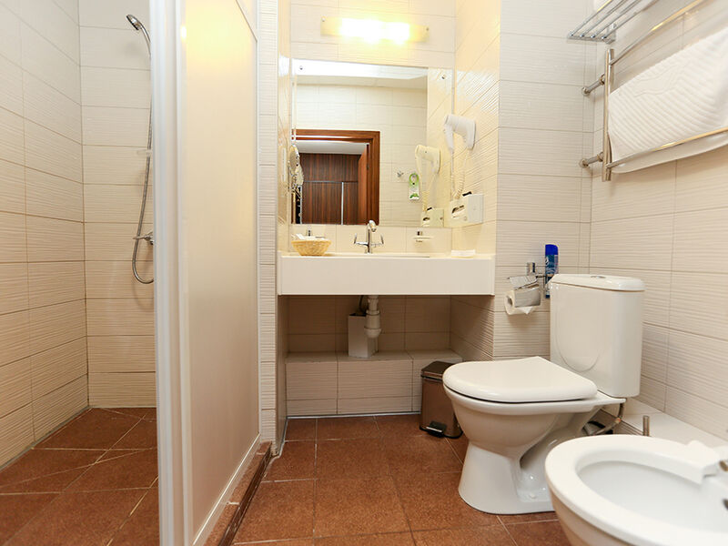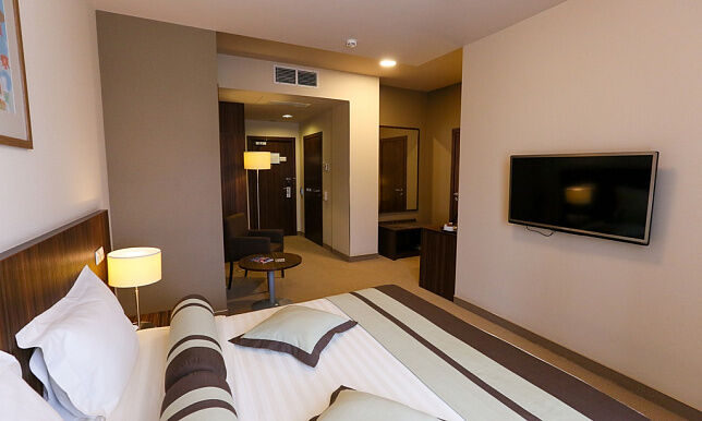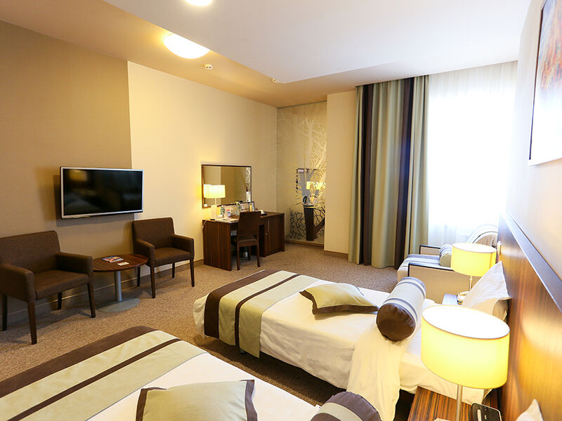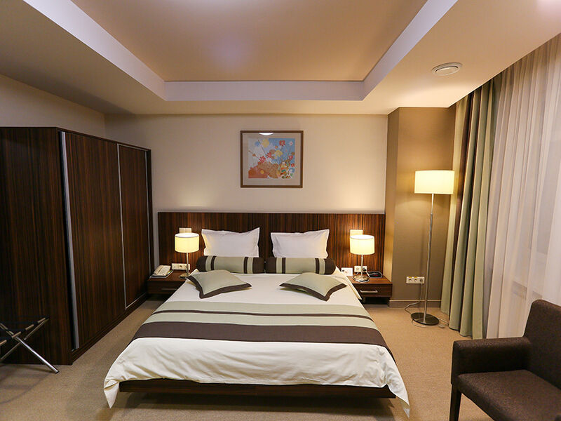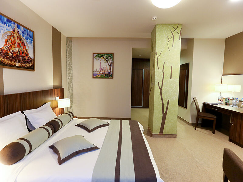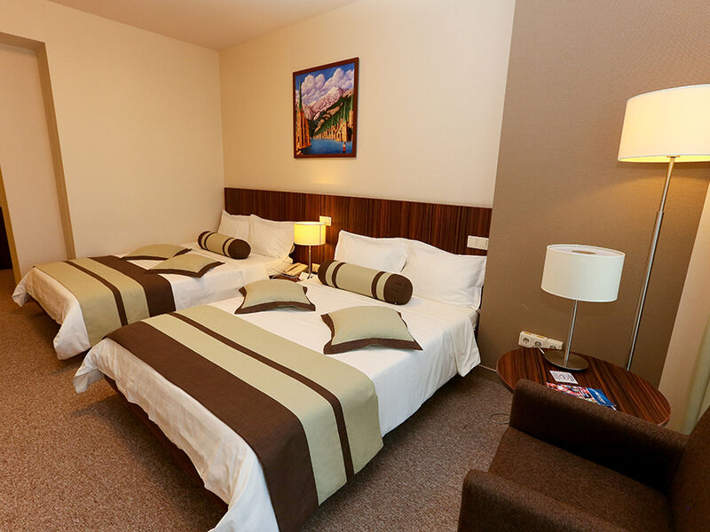 Номера хорошо меблированы, оснащены бытовой техникой, интерьеры выдержаны в классической цветовой гамме. В каждом есть ванная комната с душевой кабиной, а в номерах Люкс — собственная сауна.