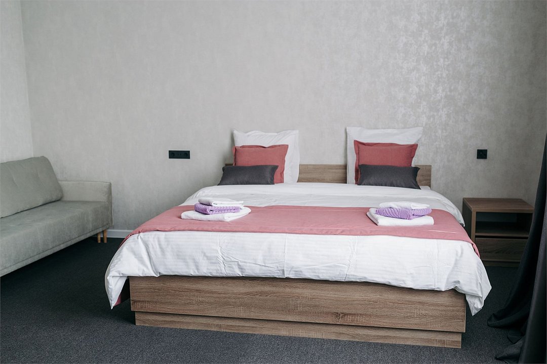 Однокомнатный двухместный номер включает в себя спальню с кроватью размера «king-size», две прикроватные тумбочки,шкаф, сейф, вешалку для одежды, рабочую зону,телевизор с плоским экраном, мини-бар, шторы блэкаут,отдельную ванную комнату с душевой кабиной(фен, бесплатные полотенца,принадлежности).Услуги и удобства