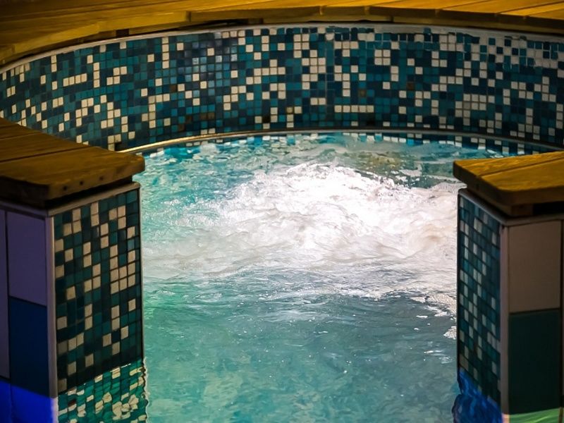 Бассейн с подсветкой воды 8 х 3 м, глубина 1,5 м, джакузи, финская парная, комната отдыха, душевые, санузел, раздевалка, фен, кулер.