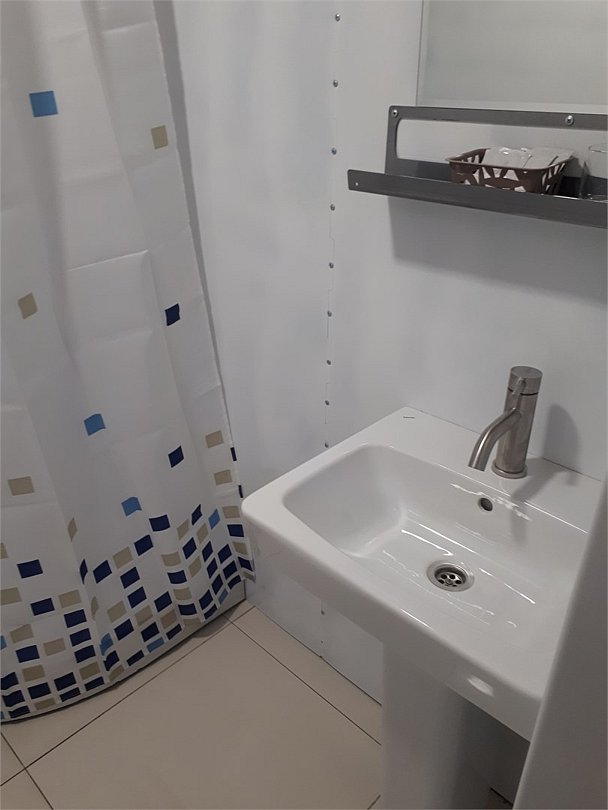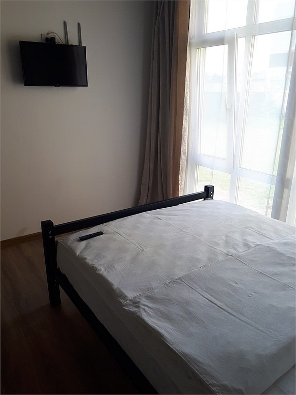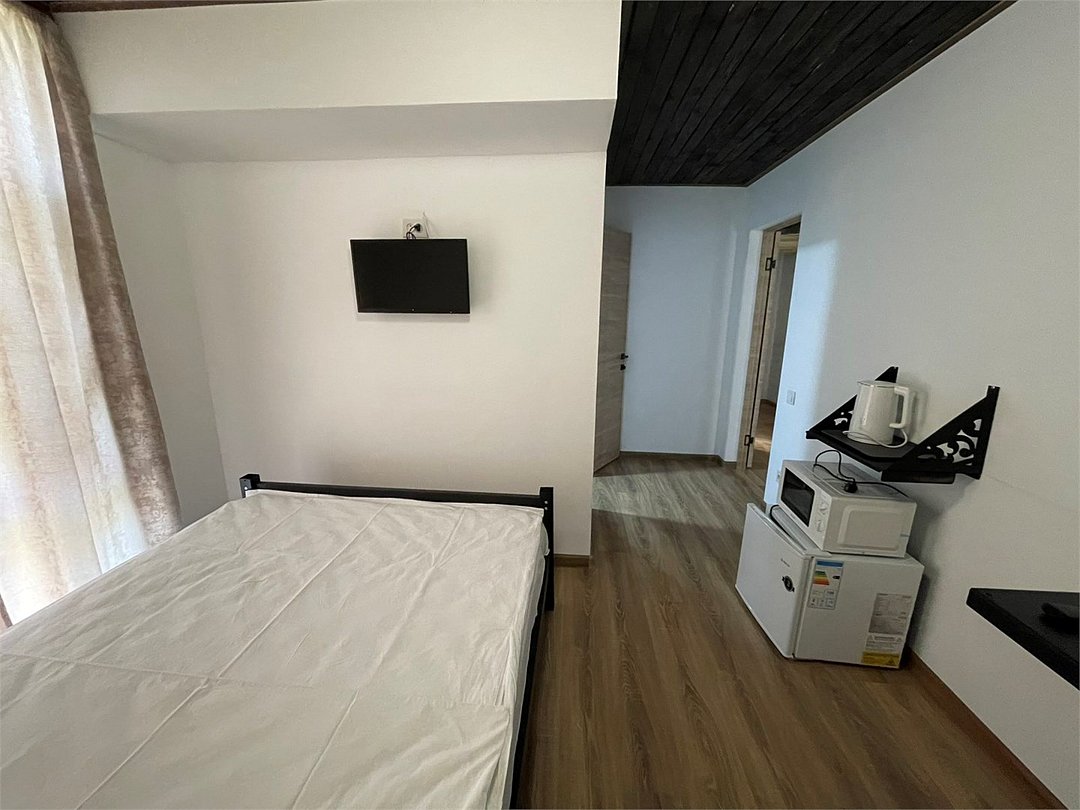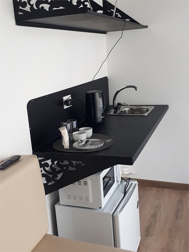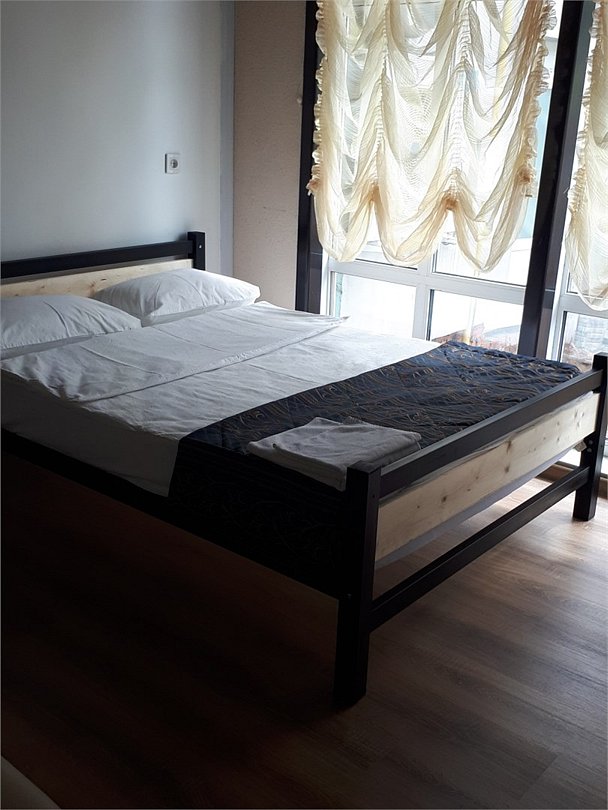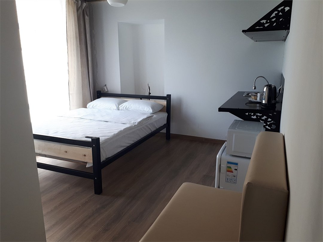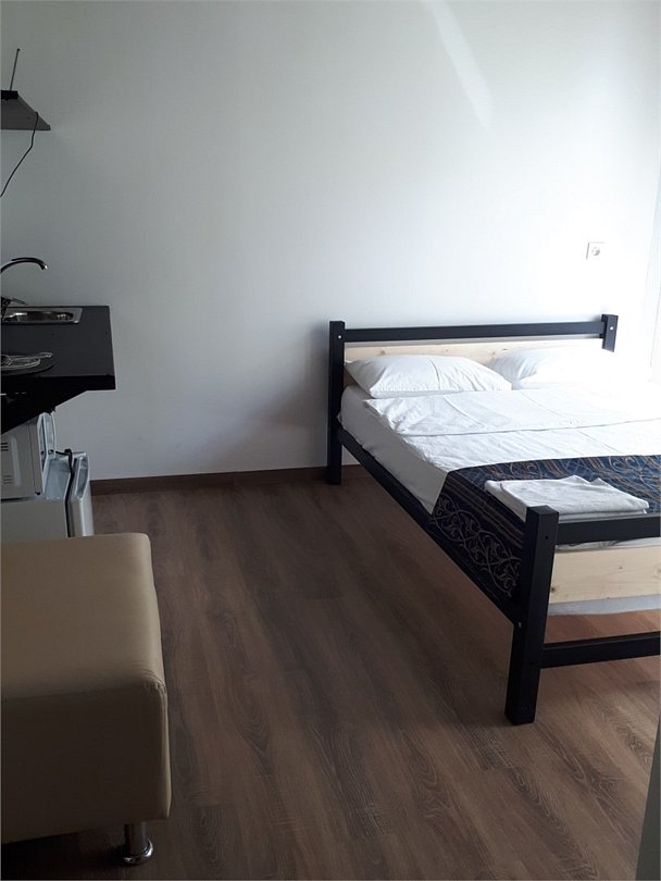 Студия 20 кв.м. с одной 2-спальной кроватью, матрас средней жесткости. Санузел, душ. Телевизор. Мини-кухня с мойкой, холодильник, электрический чайник, микроволновая печь. Диван-банкетка. В интерьере мебель из металла, деревянный потолок.Услуги и удобства