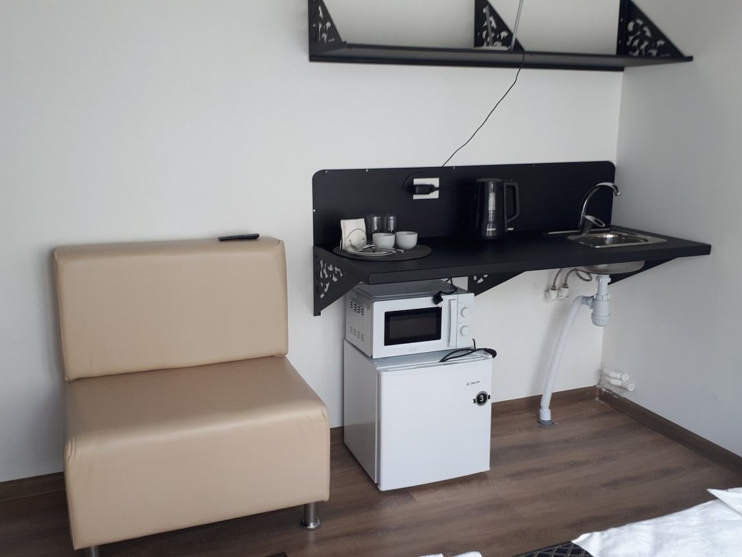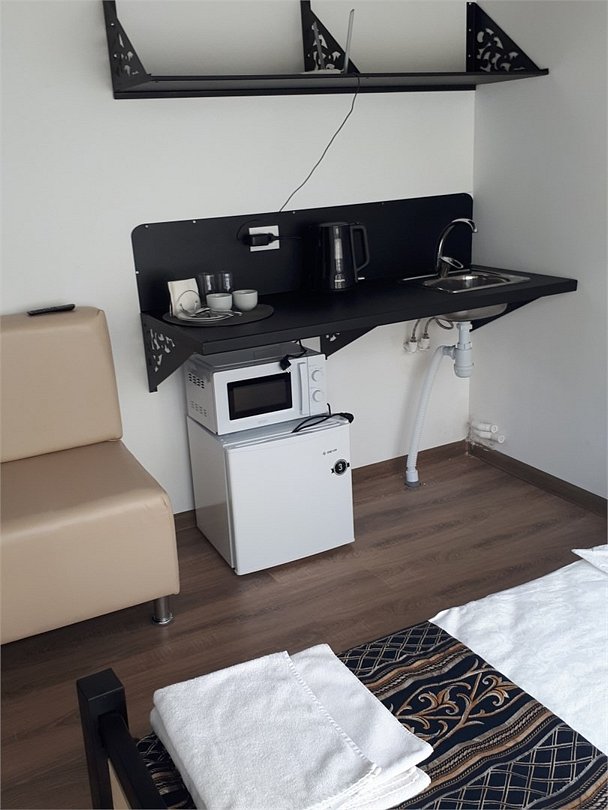 Небольшой уютный номер площадью 17 кв.м. со своей ванной комнатой - совмещенный. В номере одна 2-спальная, матрас средней жесткости. Телевизор. Мини-кухня с мойкой, холодильник, электрический чайник, микроволновая печь. Напольное покрытие -ламинат. Интерьер и предметы мебели выполнены преимущественно из металла и дерева.Услуги и удобства