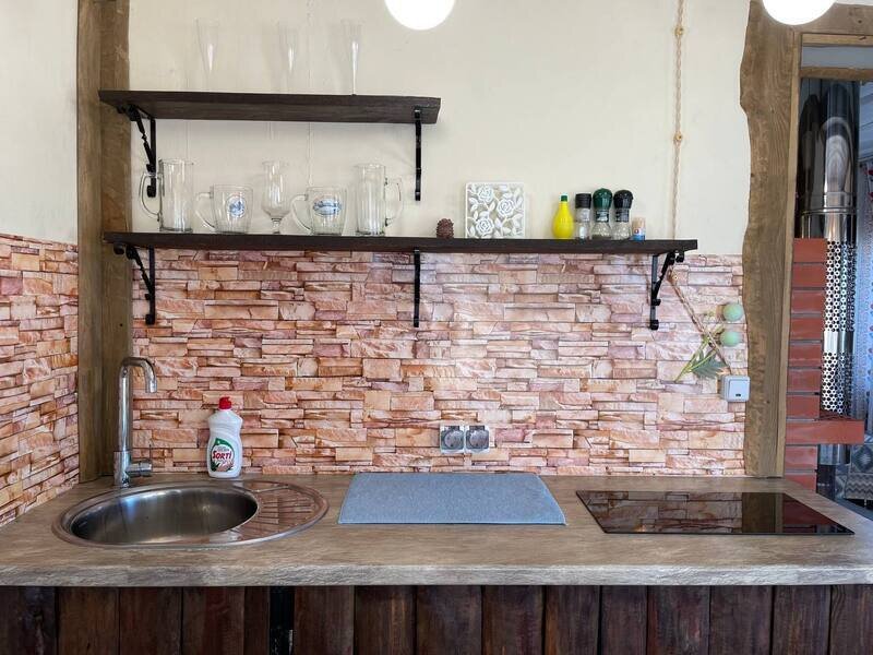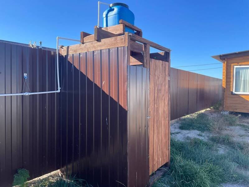 Уютный домик с небольшой территорией. На территории есть мангальная зона, стол и зонтик для пикника. Удобства (туалет и душ) на улице.