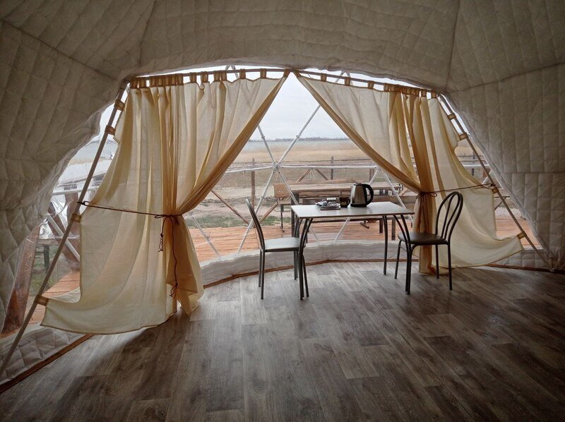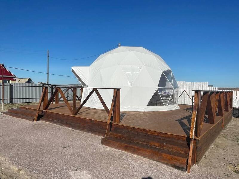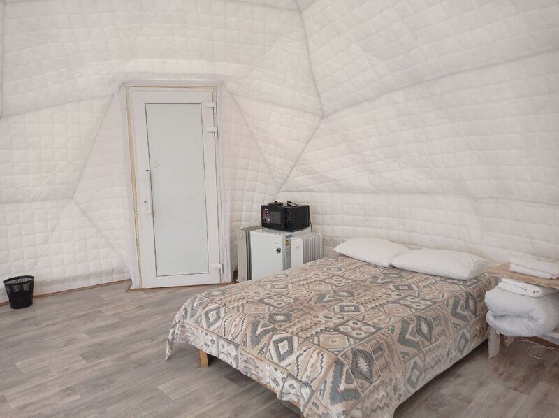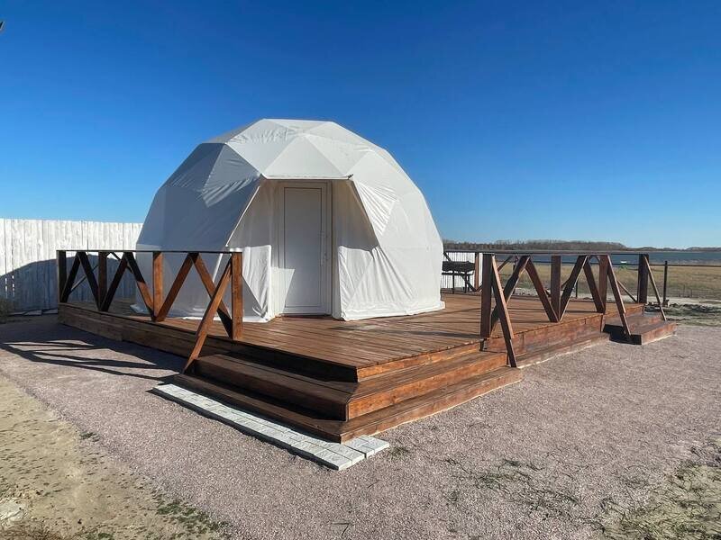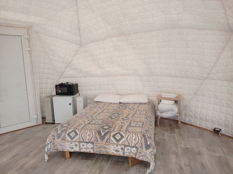 Отличный вариант для проживания парой. Сфера имеет большое панорамное окно с видом на озеро. На территории есть мангальная зона. Удобства (туалет и душ) на улице.