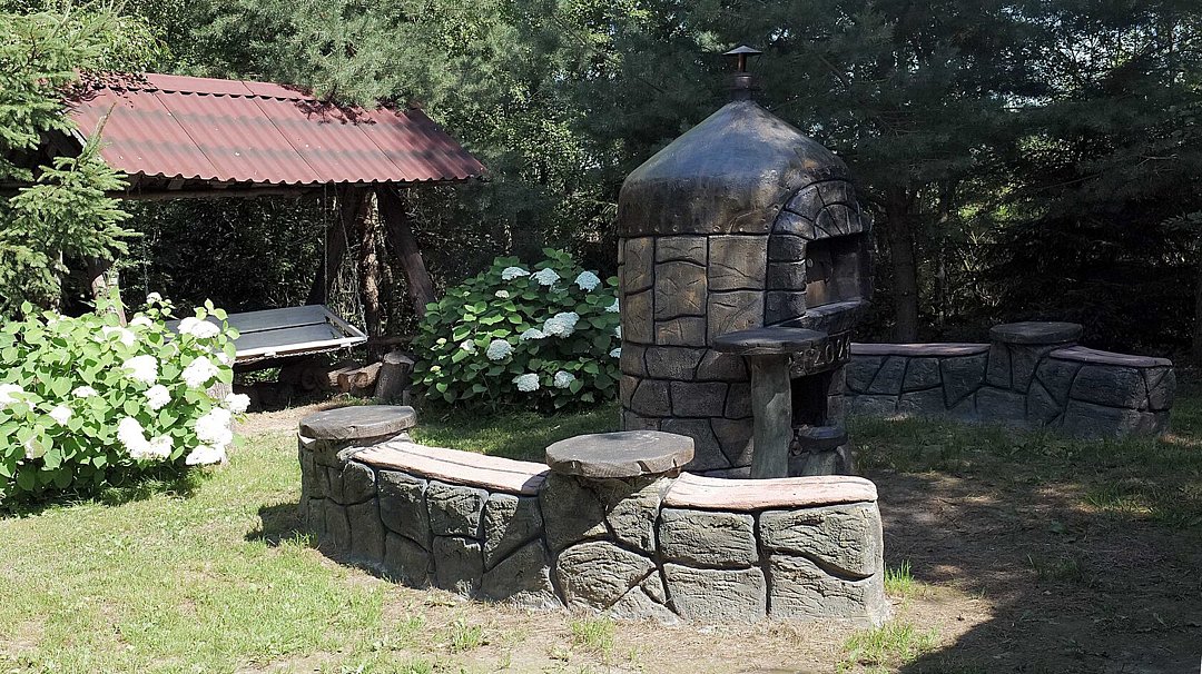 В беседке есть оригинальная печь, которая позволяет пользоваться помещением даже в морозы.
