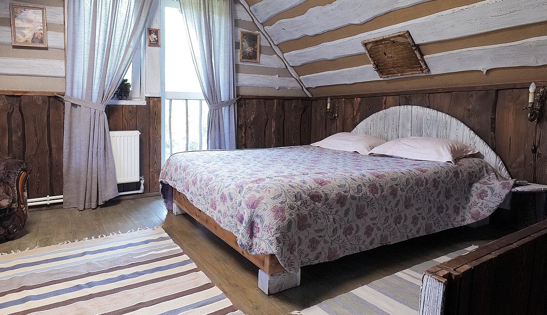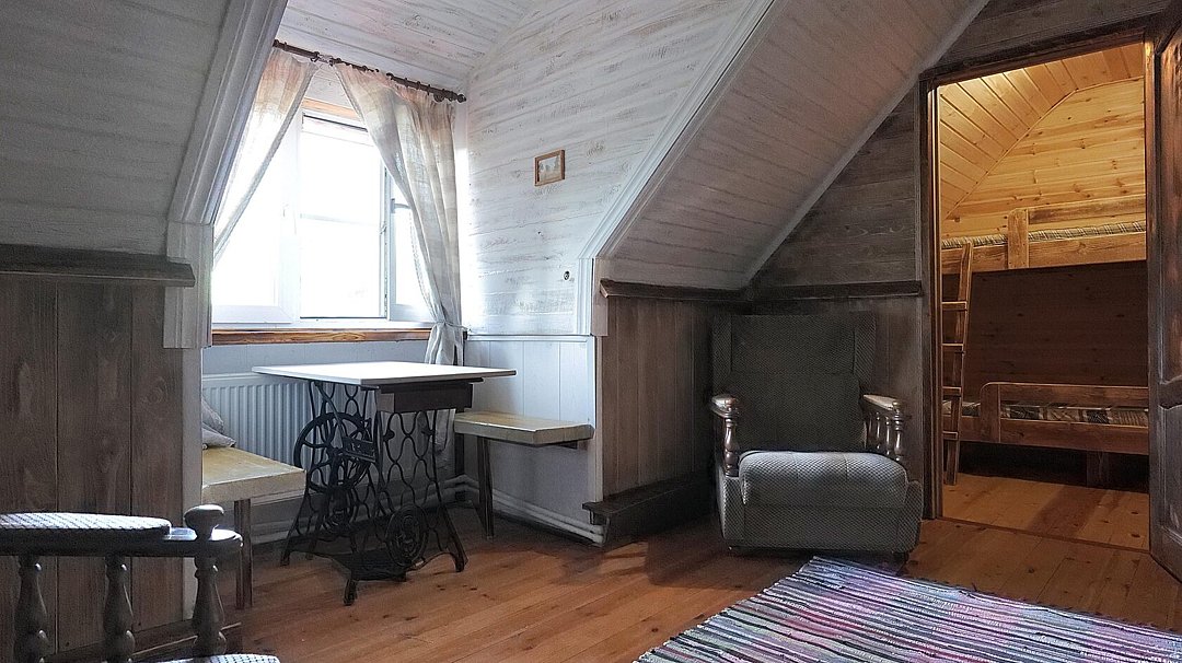 На втором этаже размещены спальня площадью 16 кв. м с двуспальной кроватью, укомплектованной соломенным матрасом, а также небольшая детская спальня без окна с двухъярусной кроватью. Апартаменты оборудованы всем необходимым для комфортного проживания: горячая и холодная вода, отопление, удобная мебель, телевизор, фен и утюг. Также предоставляются постельное бельё и полотенца.