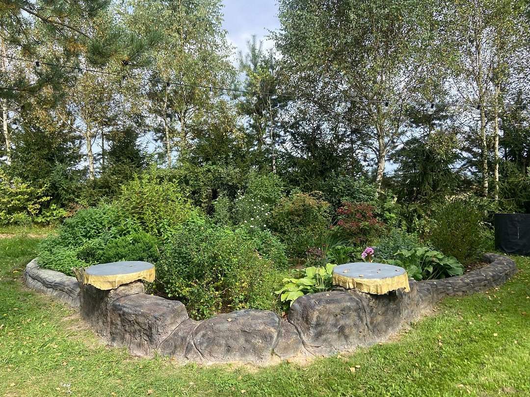 Кухня полностью оснащена для приготовления пищи: есть холодильник, плита, микроволновая печь, электрический чайник и необходимая посуда. Участок площадью 30 соток ухожен и украшен лесными и декоративными деревьями, цветниками, а также прудом с ключами.