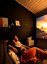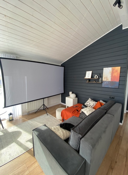 - домашний кинотеатр: большой экран 150 дюймов и проектор, а также возможность организации летнего кинотеатра на террасе с трансляцией фильмов с телефона;