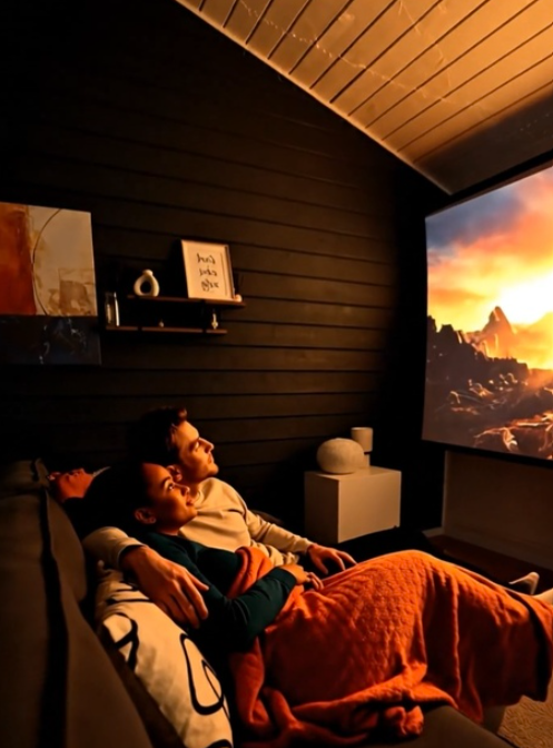 - кинотеатр: экран 150 дюймов и проектор — летний кинотеатр на террасе с трансляцией фильмов с телефона;