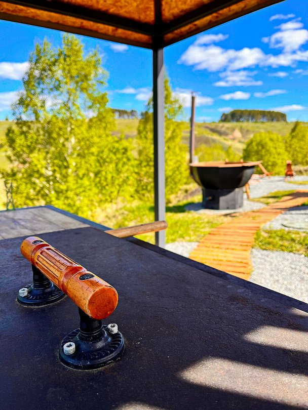 Мангальная зона с навесом позволяет готовить любимые блюда в комфортных условиях, независимо от погоды. Для удобства гостей предусмотрены шампуры и решетка.