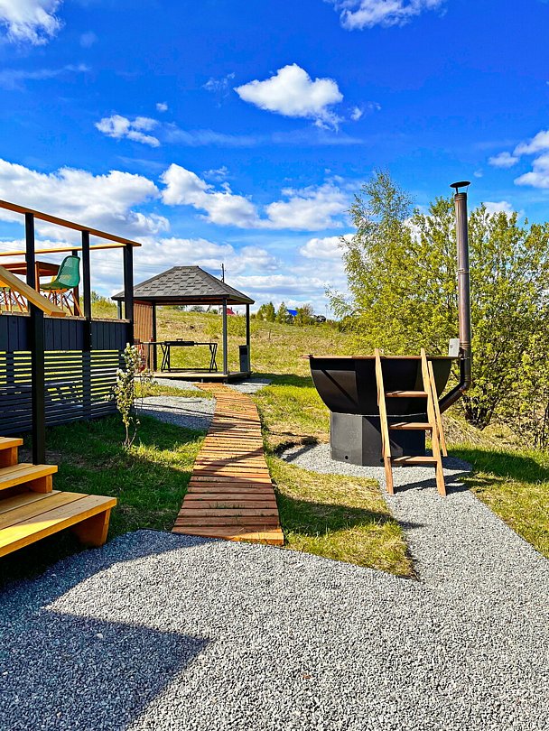Особую изюминку придает сибирский чан на открытом воздухе — настоящий источник восстановления сил и наслаждения природой в любое время года. Здесь можно расслабиться в горячей воде под звездами, посидеть у костра или приготовить барбекю в специально оборудованной зоне, наслаждаясь ароматами свежих блюд.
