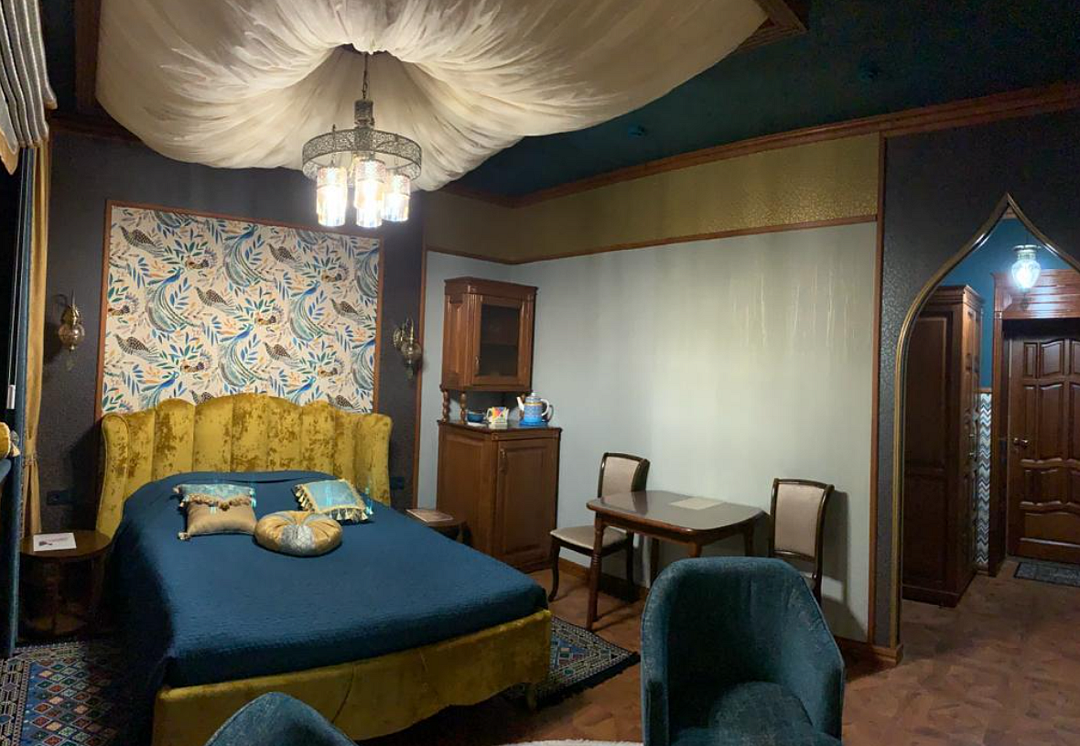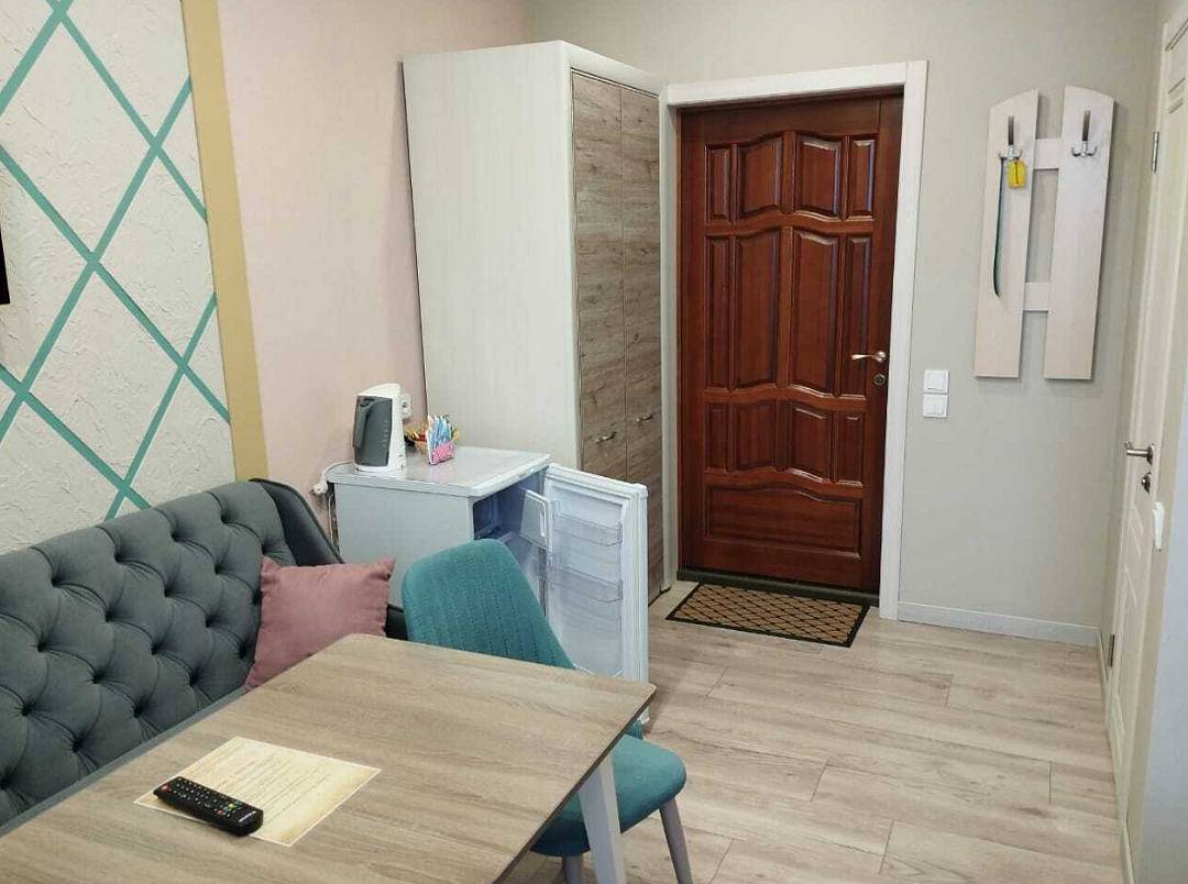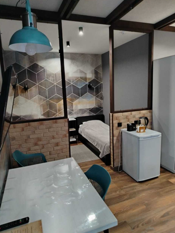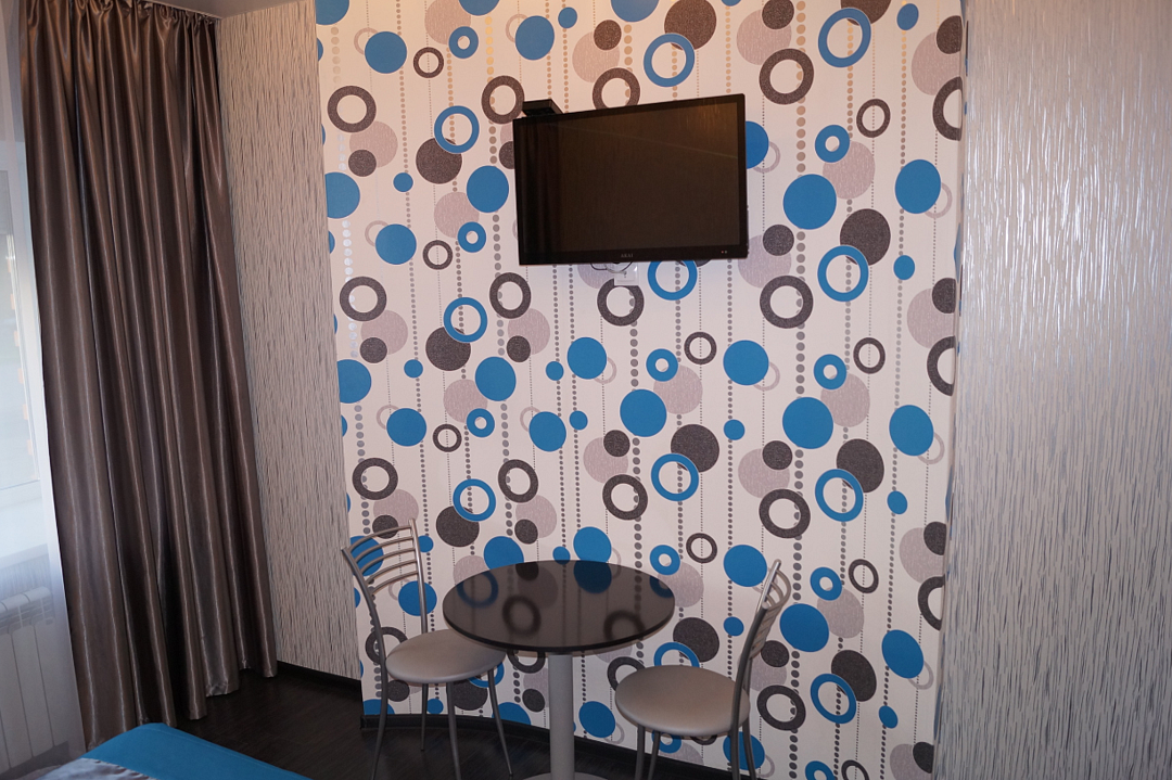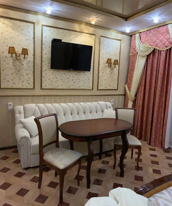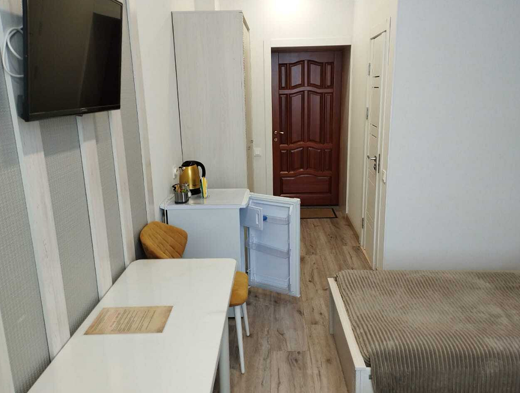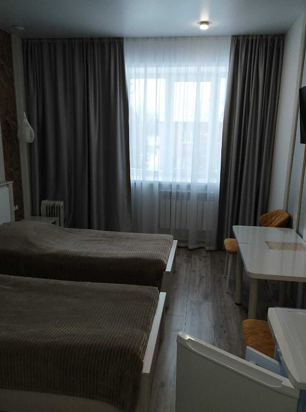 В номере две раздельные кровати и раскладывающийся диван, имеющий качественное наполнение. Так же: бесплатный Wi-Fi, телевизор, холодильник, чайник, фен, полотенца, халаты, тапочки. Чай и кофе, в подарок. Туалет и душевая в номере. Санузел имеет подогрев пола. Ортопедические матрасы позволят отлично выспаться и отдохнуть после трудового дня или дальней дороги. Шторы блекаут даже в дневное время создадут обстановку ночи.