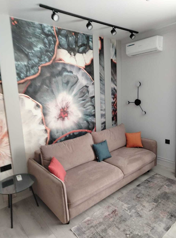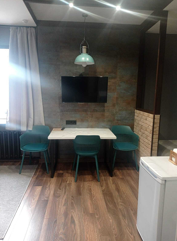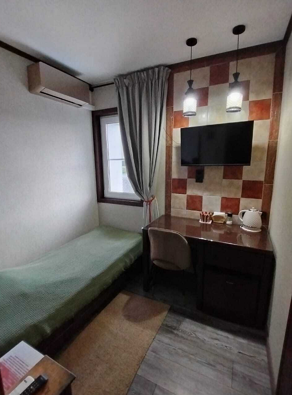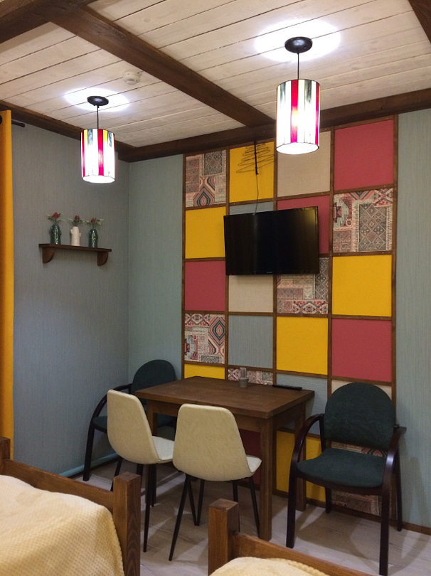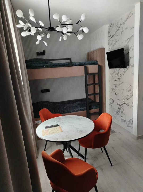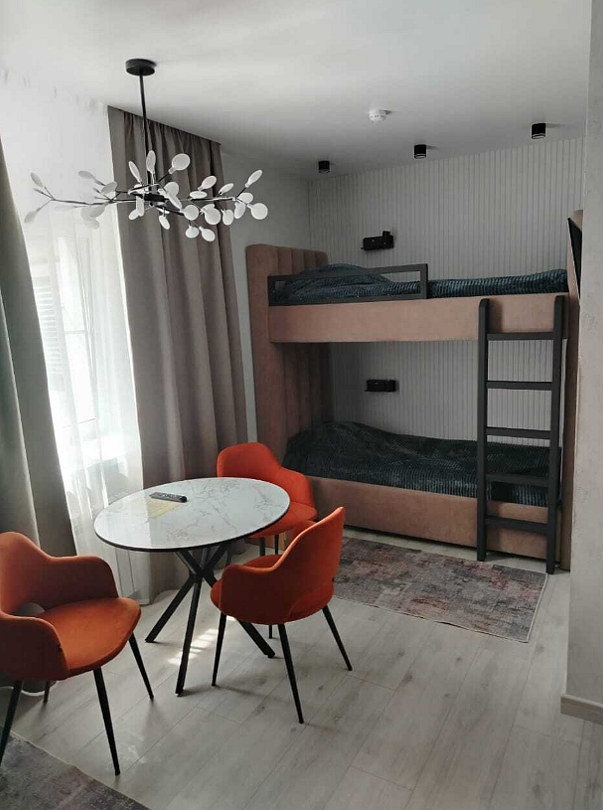 В номере двухярусная кровать и диван с качественным наполнением. Так же: бесплатный Wi-Fi, кондиционер с функцией обогрева в весенний и осенний период, телевизор, холодильник, чайник, кухонные принадлежности, фен, полотенца, халаты, тапочки. Чай и кофе, в подарок. Шторы блекаут, что положительно скажется на качествен сна. Туалет и душевая в номере. Санузел имеет подогрев.