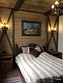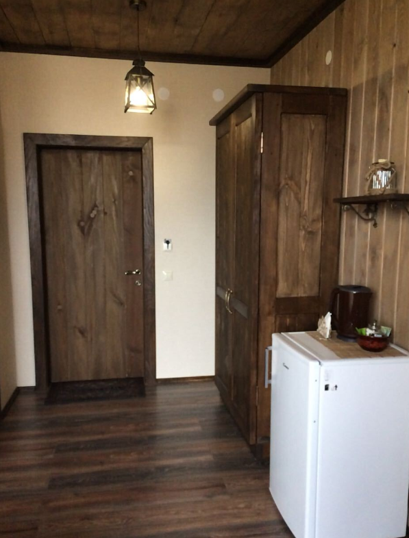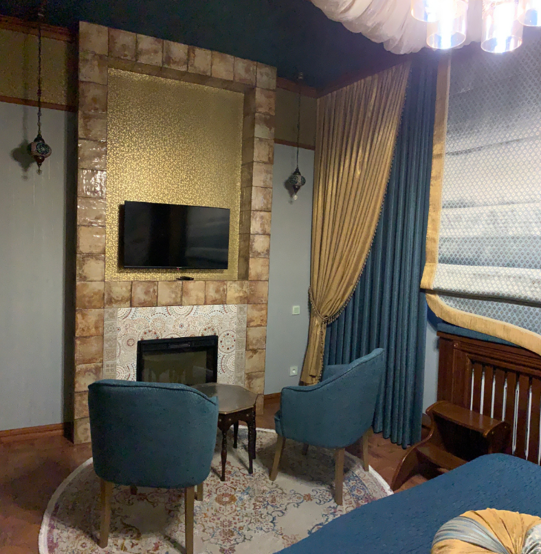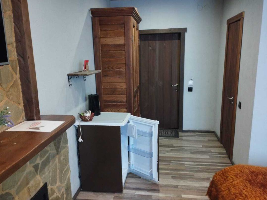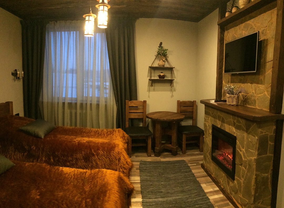 Номер полностью укомплектован: бесплатный Wi-Fi, телевизор, холодильник, чайник, фен, посуда, полотенца, интернет, кухонные принадлежности, халаты, тапочки. Чай и кофе в подарок. Кровати с ортопедическими матрасами, что позволит отлично выспаться. Камин создаст романтическую обстановку. Кровати и мебель выполнены из цельного дерева, запах которого приятно порадует. Санузел имеет подогрев.