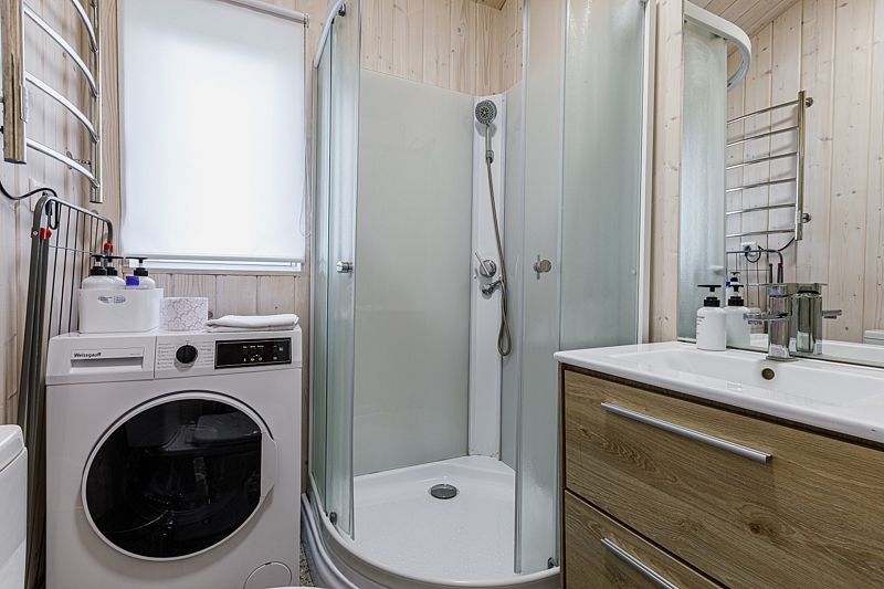- санузел с теплым полом, душевой кабиной, унитазом, раковиной, феном и зеркалом с подсветкой;