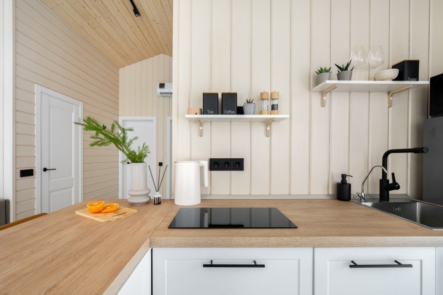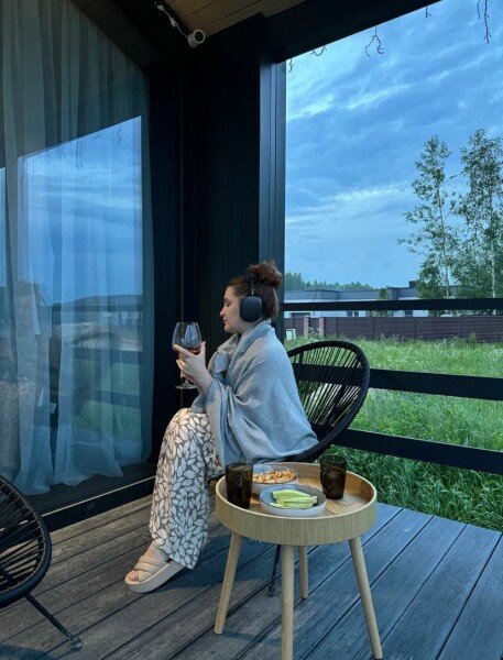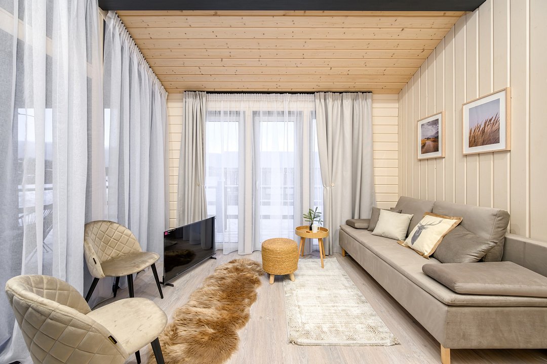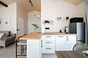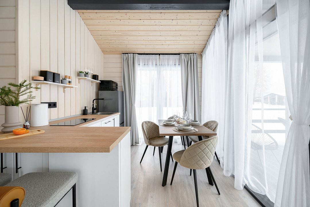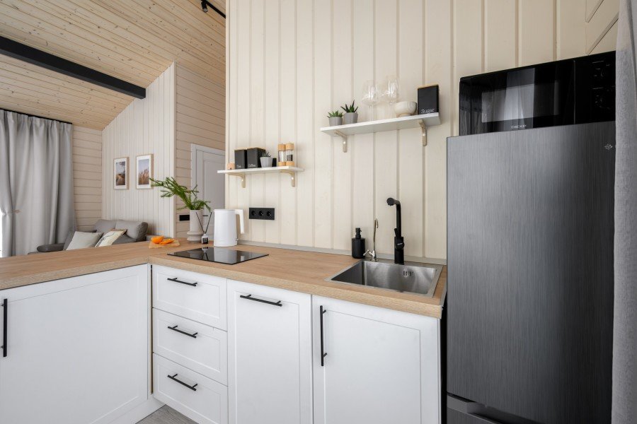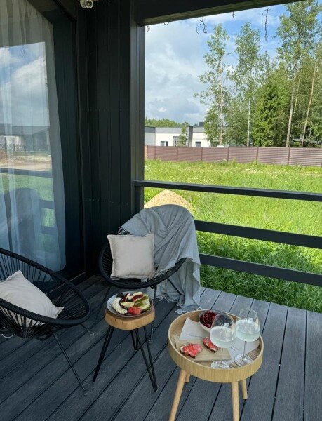 В доме есть все необходимое для комфортного проживания: две изолированные спальни с двуспальными кроватями, кухня-гостиная с раскладным двуспальным диваном и большим телевизором, а также санузел с душевой кабиной.