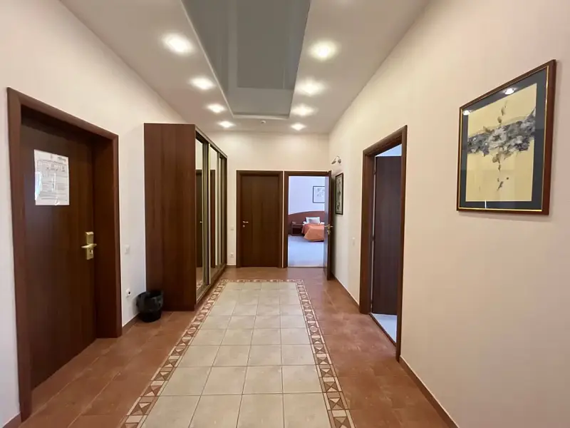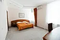 Оригинально оформленные номера категории «Апартаменты» отлично подойдут для беззаботного отдыха. В них есть абсолютно все. Просторная спальная комната с большой кроватью, шкафом-купе и туалетным столиком, комната поменьше с двумя односпальными кроватями и вместительной тумбой, гостиная зона с угловым диваном (раскладные диваны предоставляют возможность размещения 1 гостя), кухонная зона, оборудованная электрической плитой, мойкой и кухонной утварью. Две ванные комнаты (одна из которых оборудована стиральной машинкой и биде) и отдельная гардеробная.