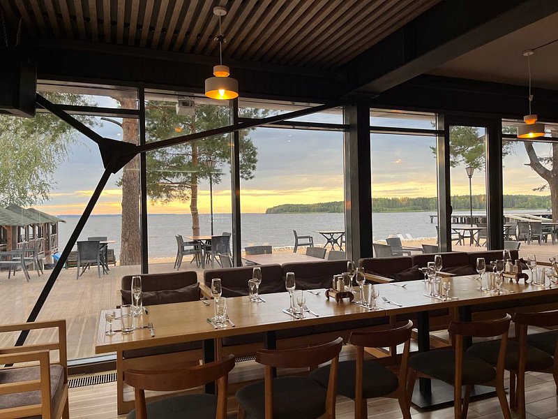 Панорамные окна окутывают пространство ресторана, позволяя гостям наслаждаться захватывающим видом на Горьковское море в любое время дня. Утром вы можете насладиться рассветом, а вечером — волшебными закатами, создающими неповторимую атмосферу.