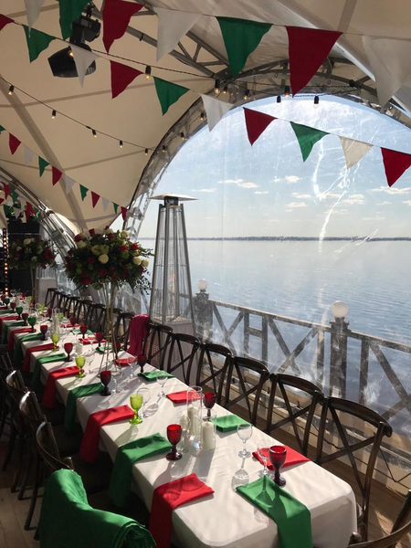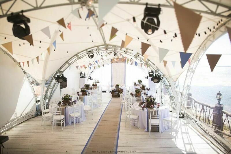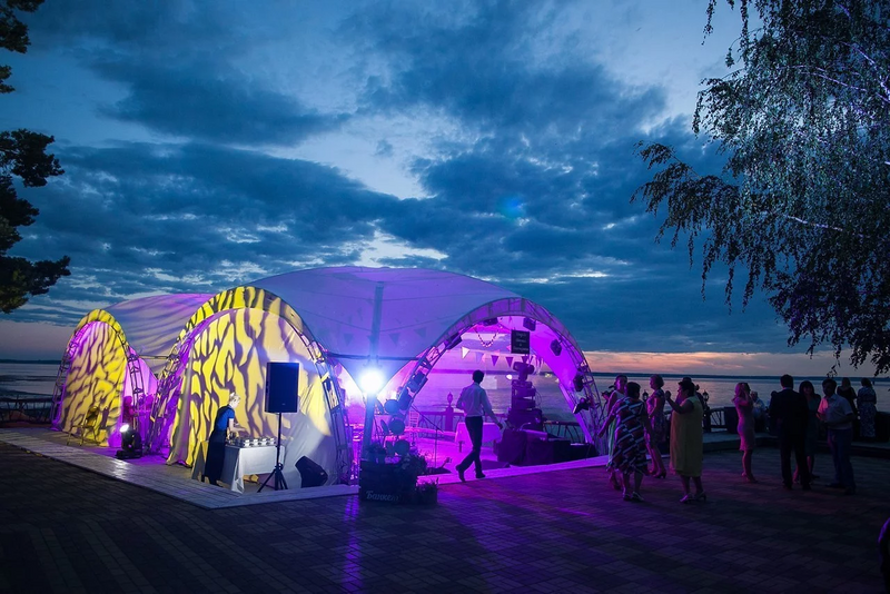 Аренда летнего шатра на воде (предоставляются банкетные столы, банкетный текстиль, доступ к электричеству, обогреватели).