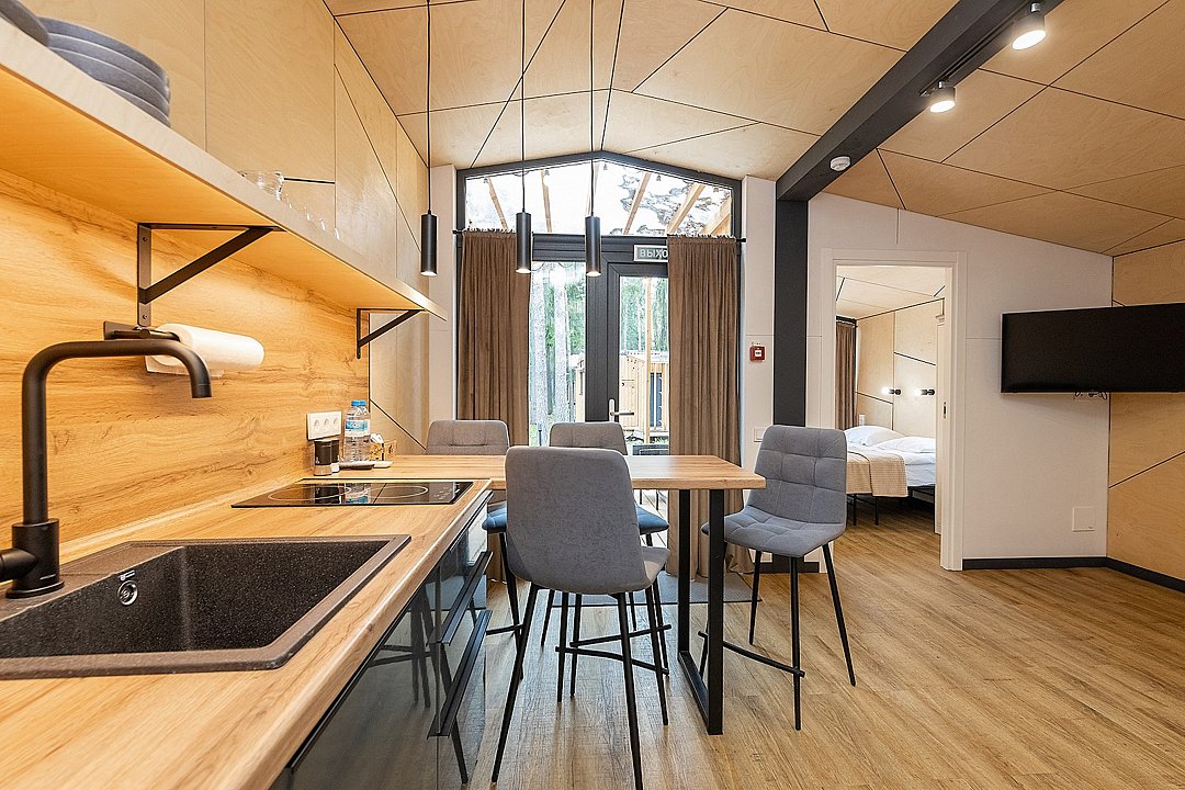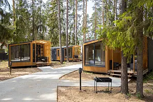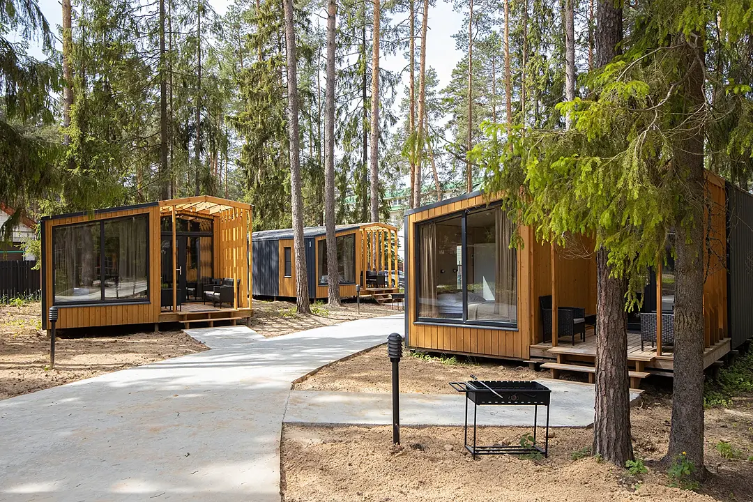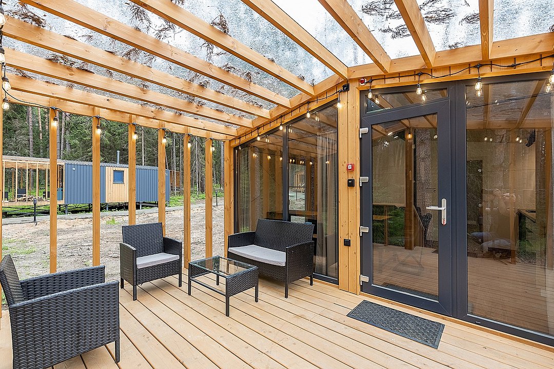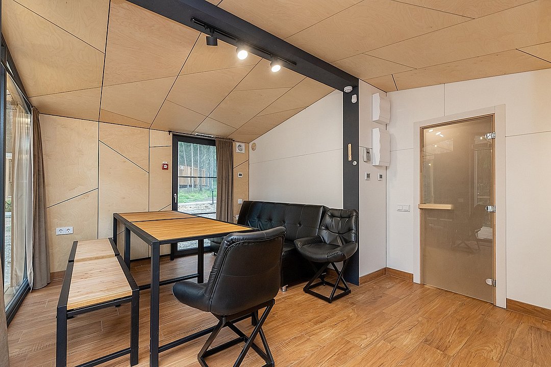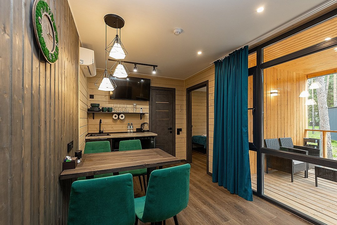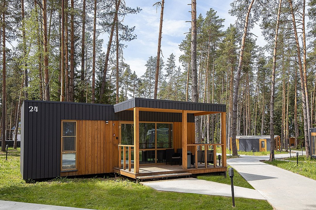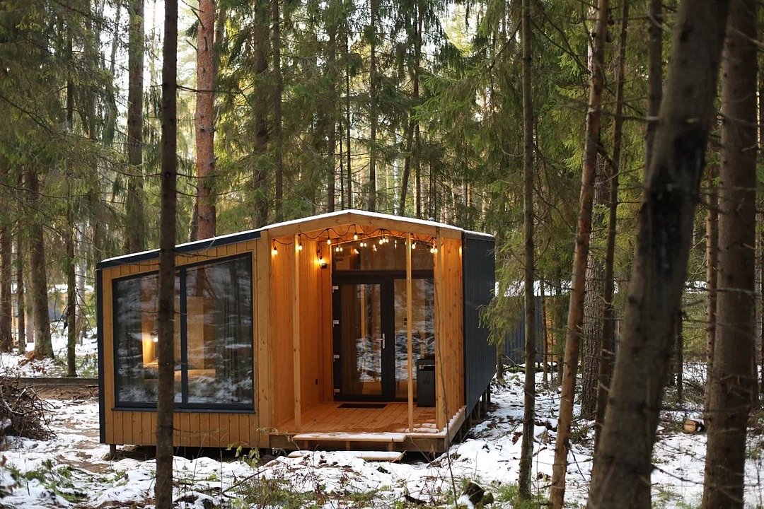 Дом по типу «Тинихаус» отлично подходит для отдыха вдвоем тем, кто любит небольшие уютные пространства и получает удовольствие от оптимизации места и нестандартных решений. Панорамное окно из гостиной открывают вид на сосновый лес и извилистые дорожки глэмпинга.Услуги и удобства