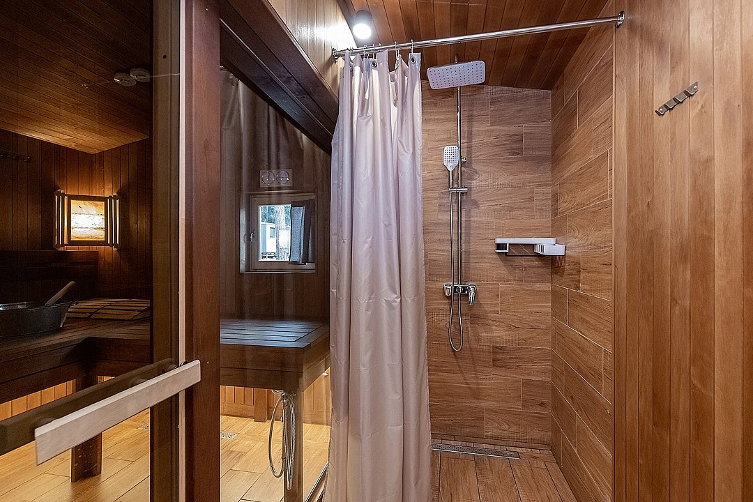 Wi-Fi, фен, банные принадлежности, тапочки, сауна, терраса, стулья, вешалки, обеденный стол, чайный набор, набор посуды, чайник, раковина, питьевая вода, кухонная посуда, стаканы, стол, туалет, диван-кровать, раскладной диван, мини-холодильник, мини-кухня, кухонный уголок, телевизор со Smart TV, теплые полы, вид на лес, бутилированная вода, мыло, затемняющая штора, без питомцев, баняВ домике