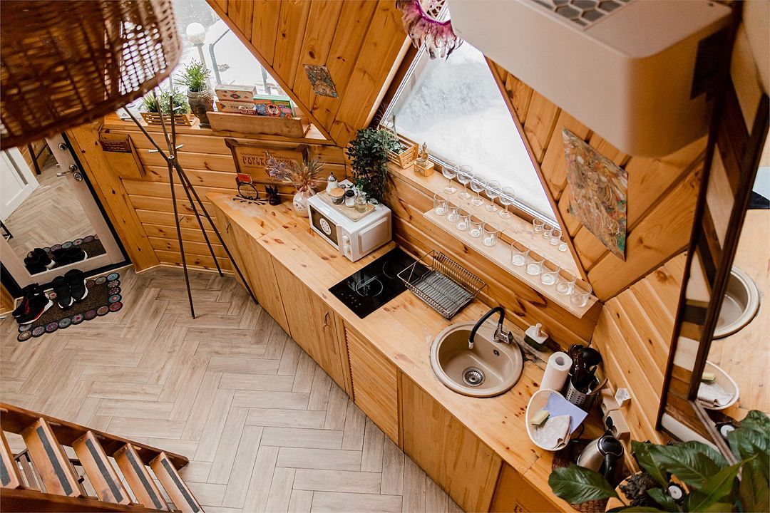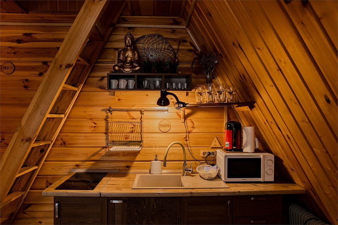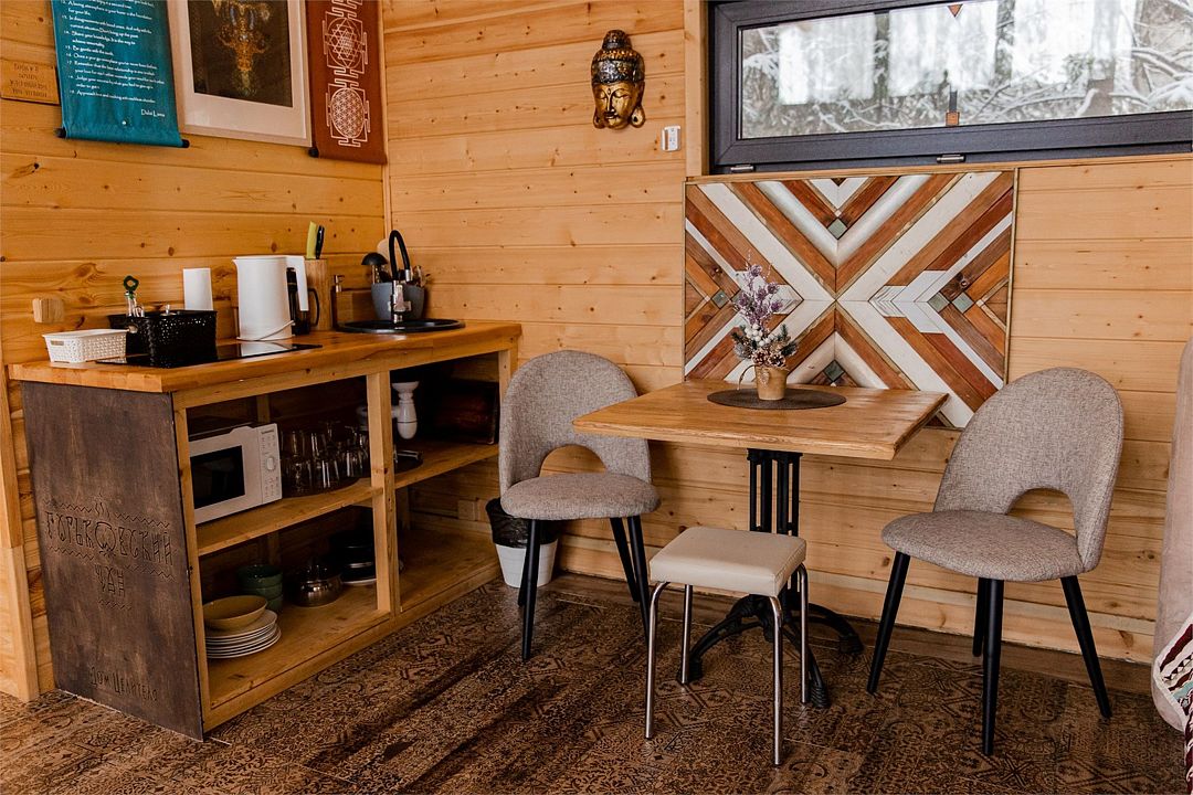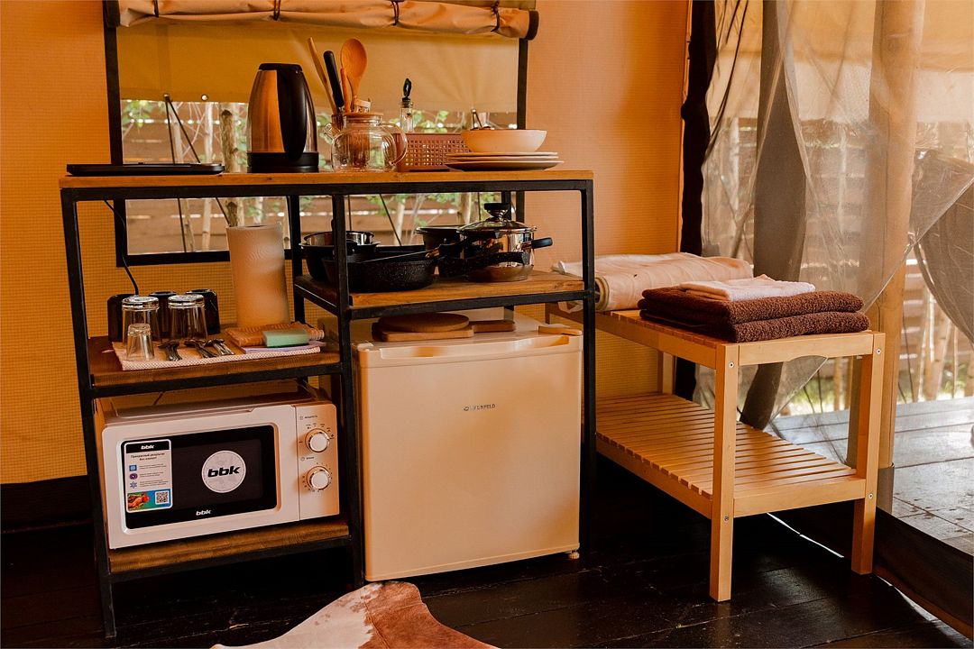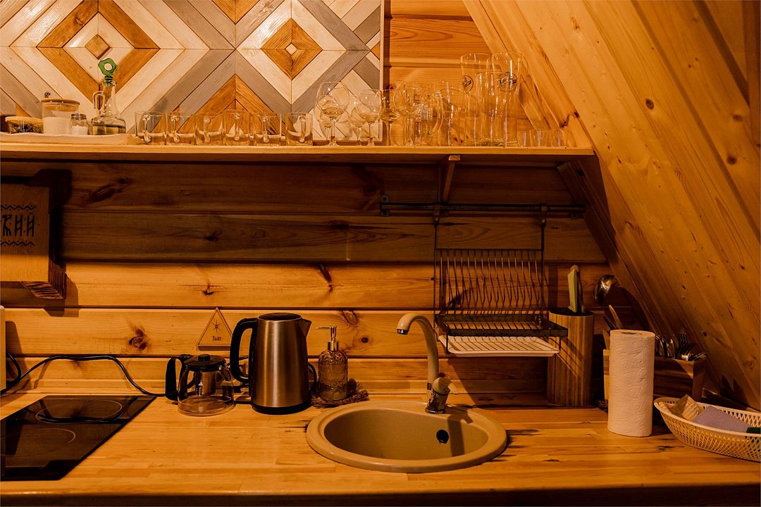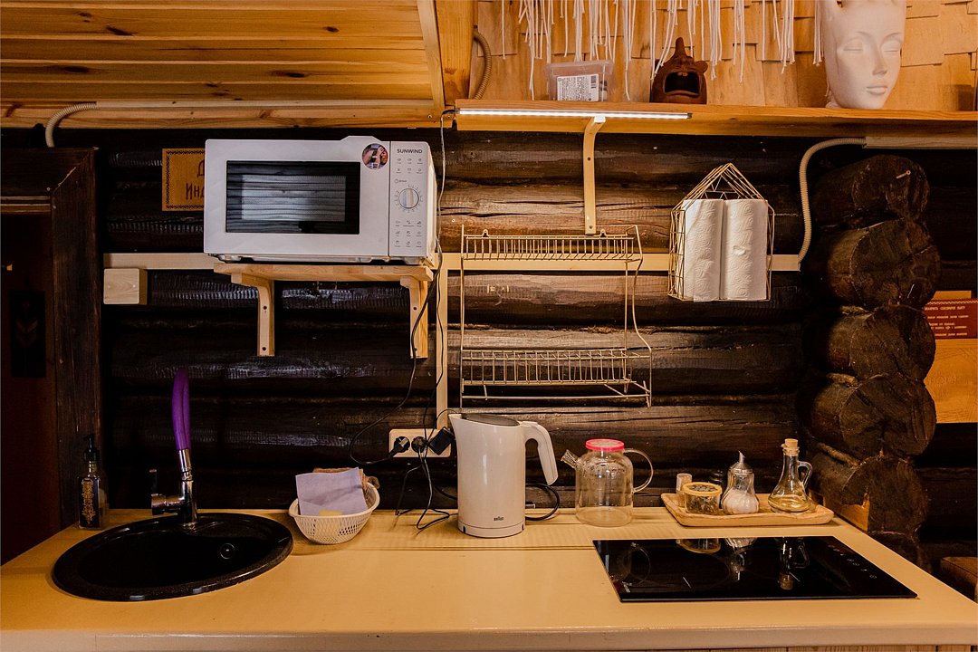 Мини-кухня, оборудованная всем необходимым. В наличии питьевая вода из скважины, базовый набор: масло, чай, сахар, соль.