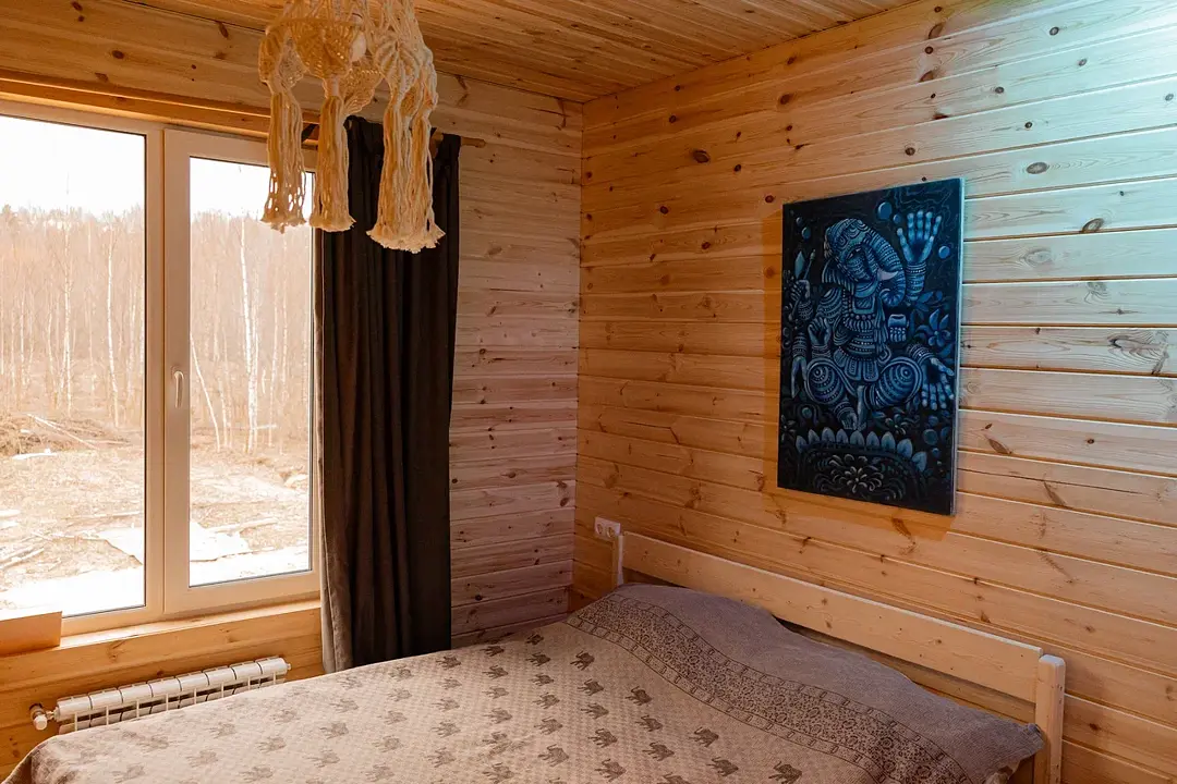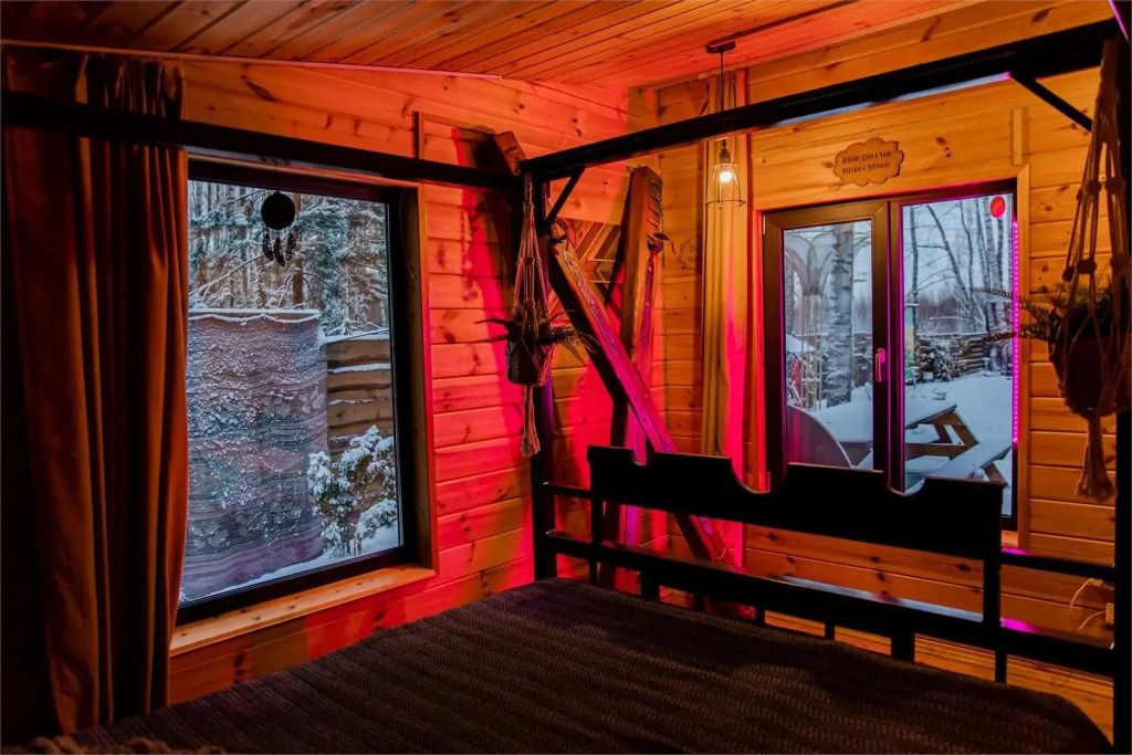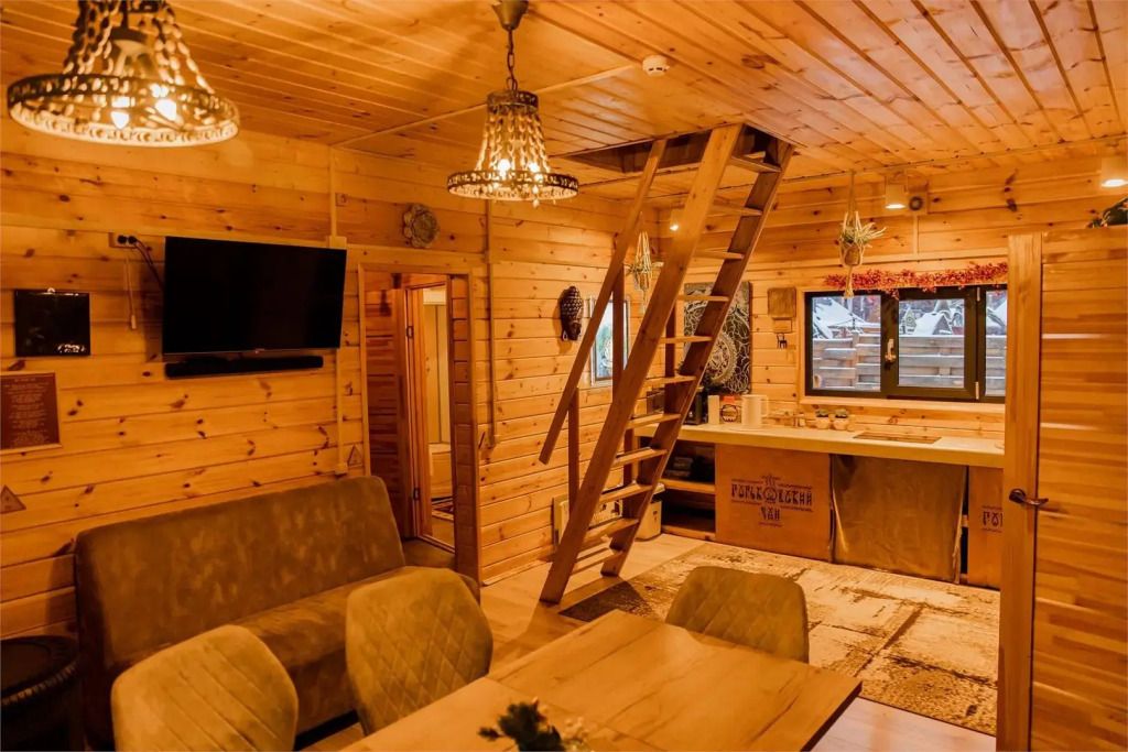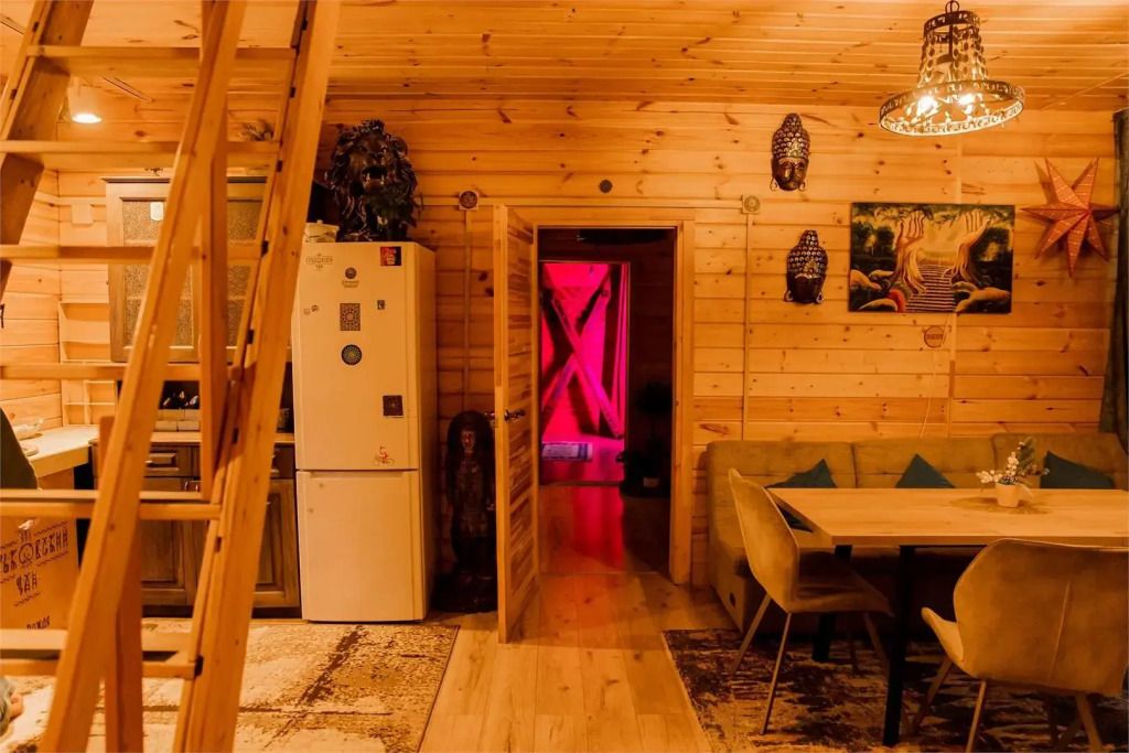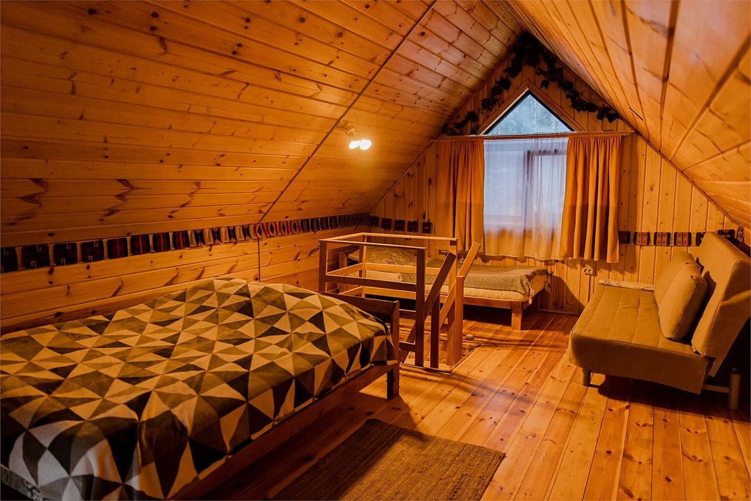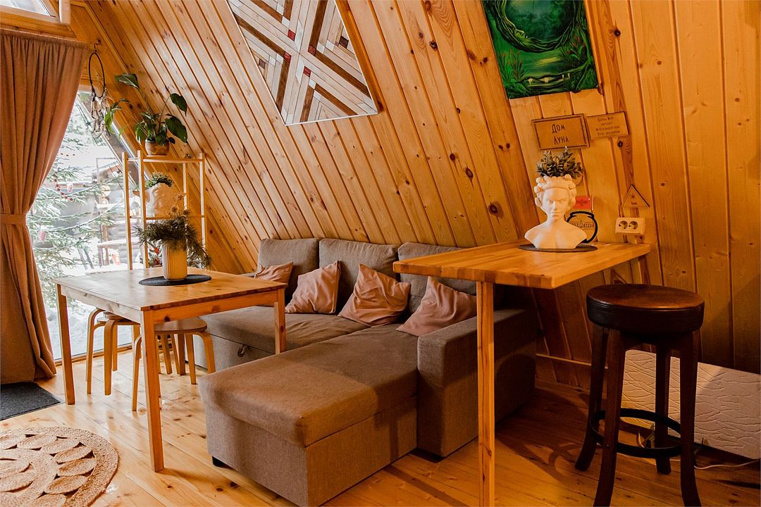 Гостиная комната с кухней, каминной печью. Комната «Псай» с двуспальным диваном, спальная комната с особенной двуспальной кроватью, лаудж с двуспальным диваном, панорамным окном и теплым полом. 2 этаж-спальня на 5 гостей.
