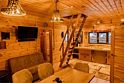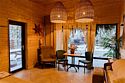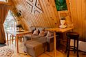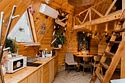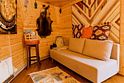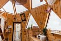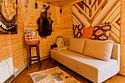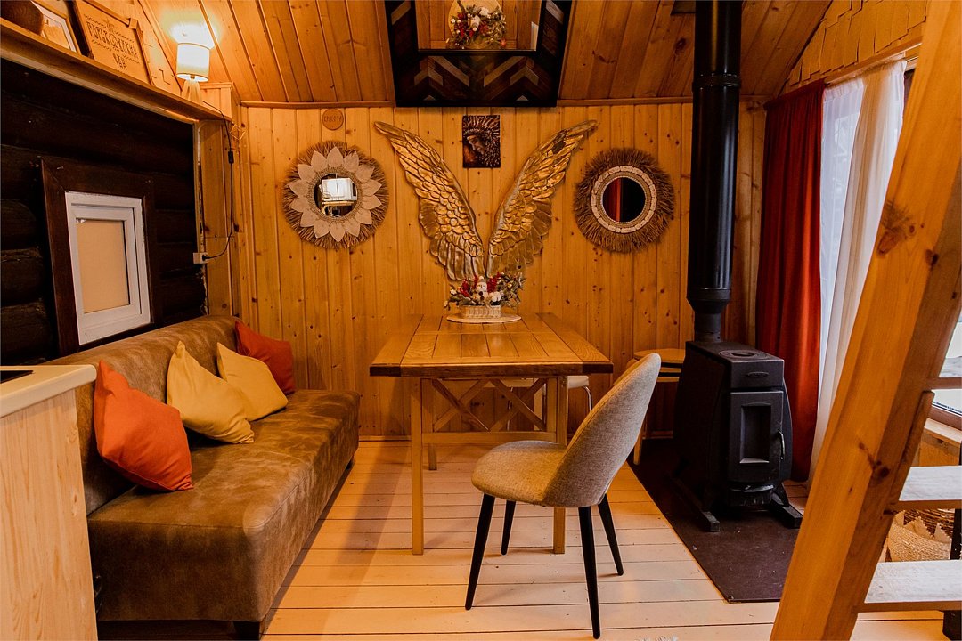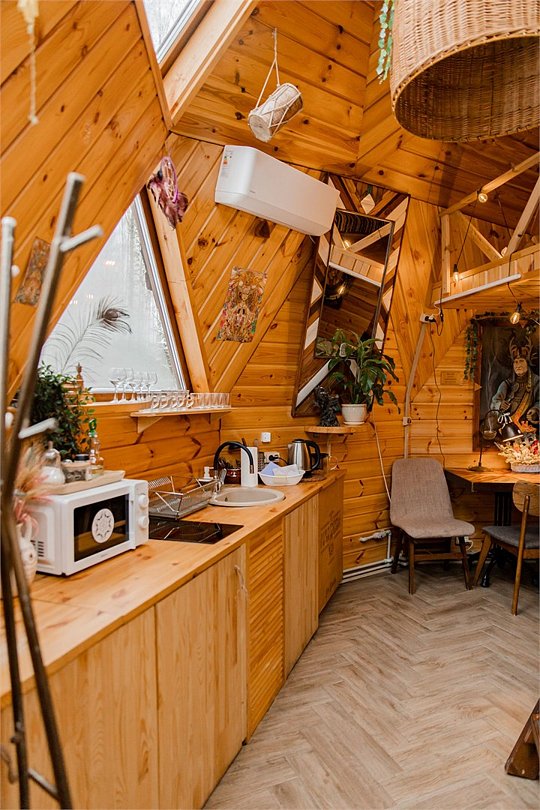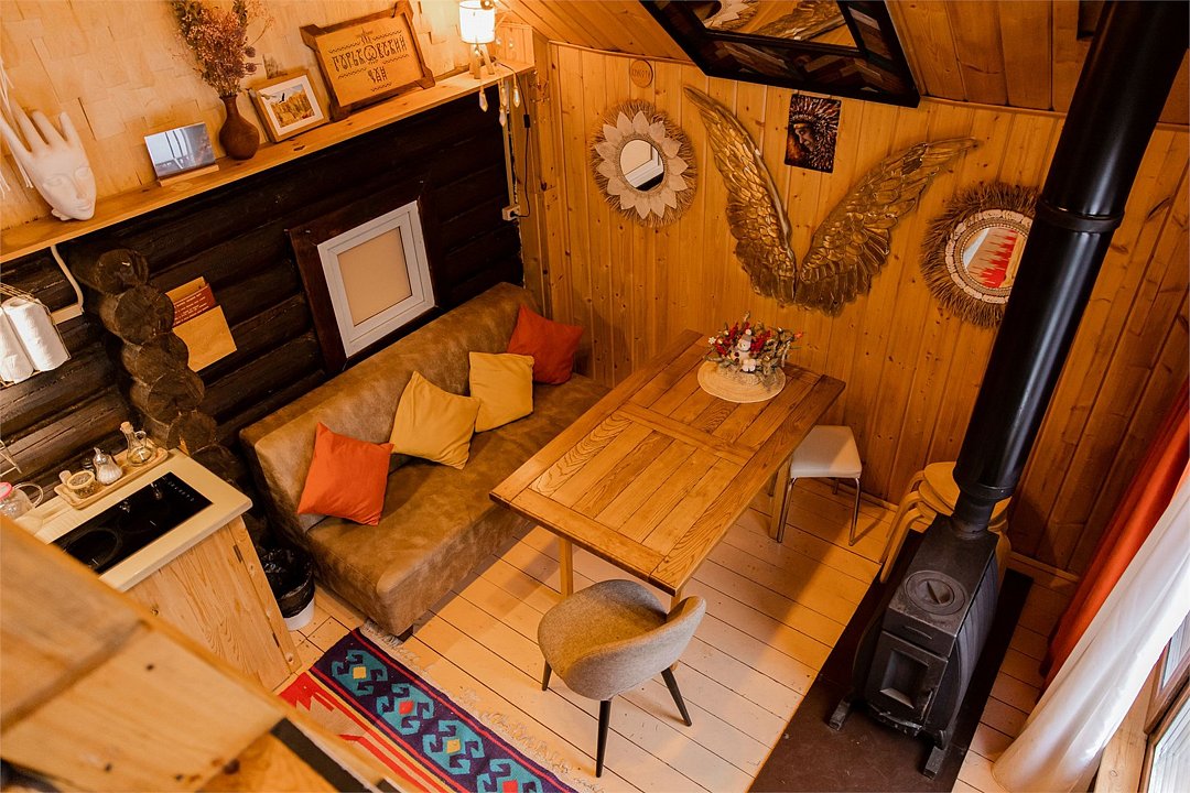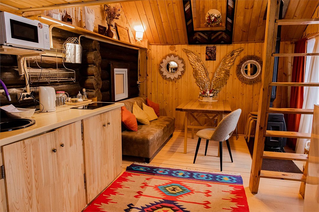 Внутри — две односпальные кровати, которые можно сдвинуть или раздвинуть по желанию, односпальный диван. Мини-кухня, оборудованная всем необходимым. В домике — раздельные душ и туалет, горячая вода.