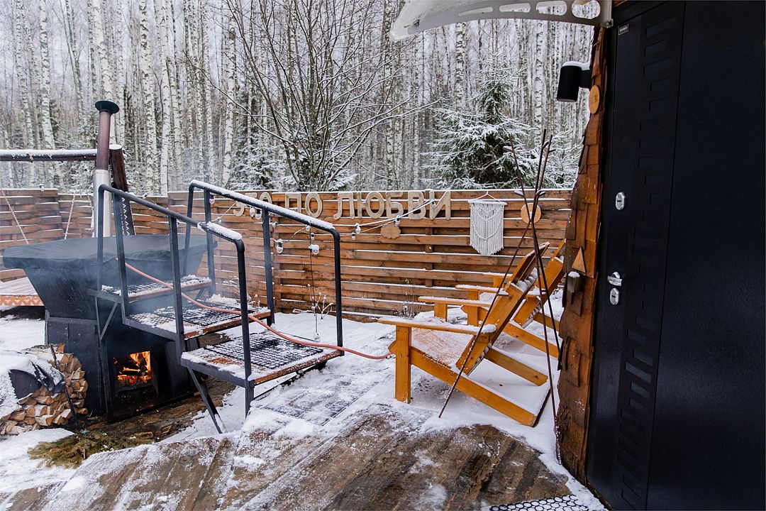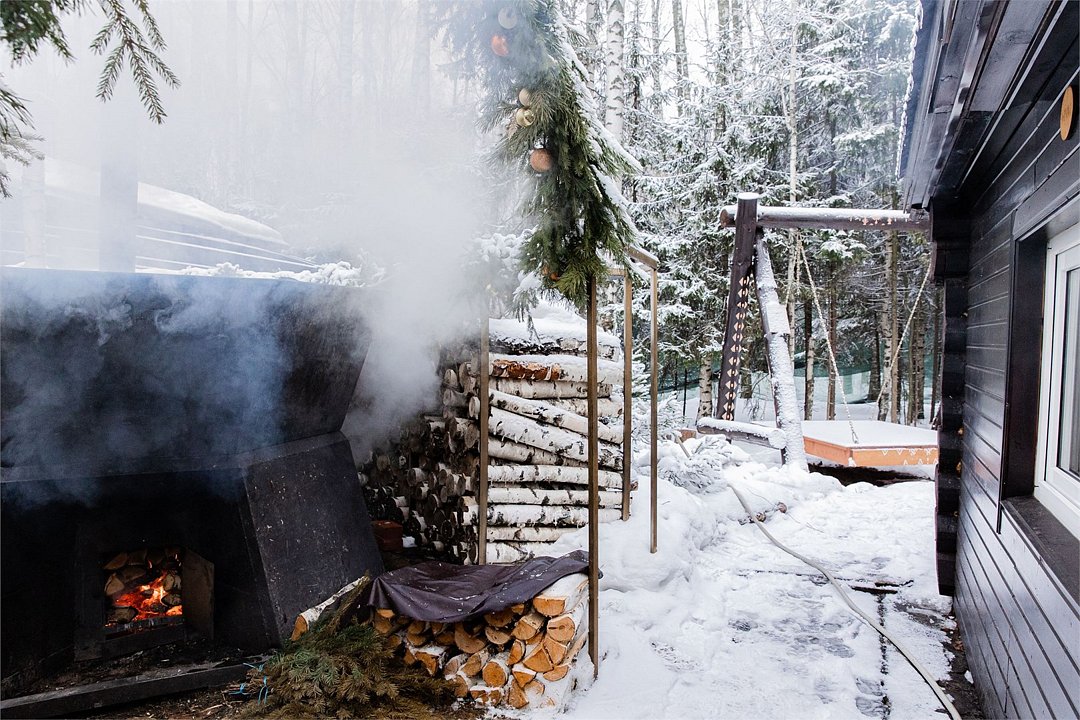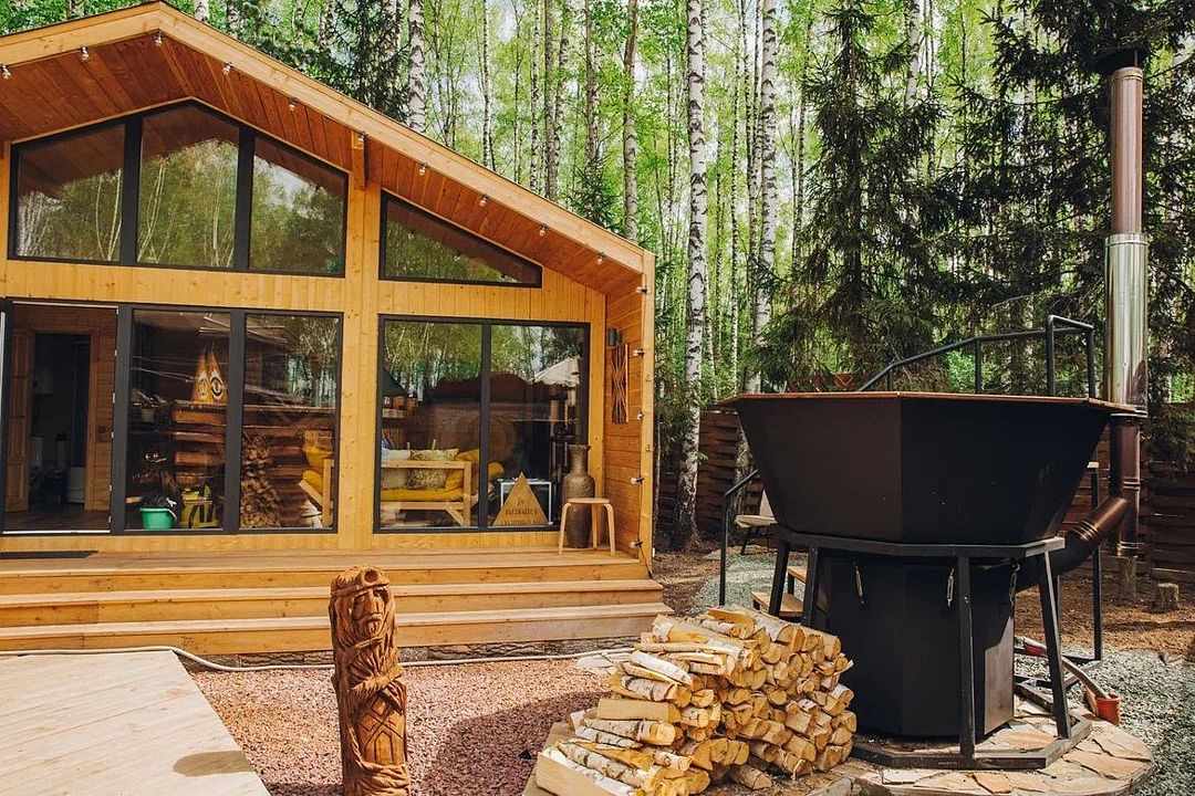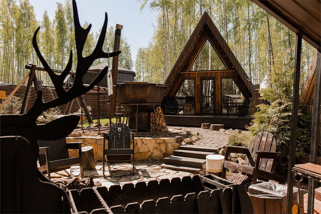 Территория Дома приватная, безлимитный чан (топит чанный мастер) со своим веником запрещено, крытая беседка a-frame, очаг, мангал-олень, качель.