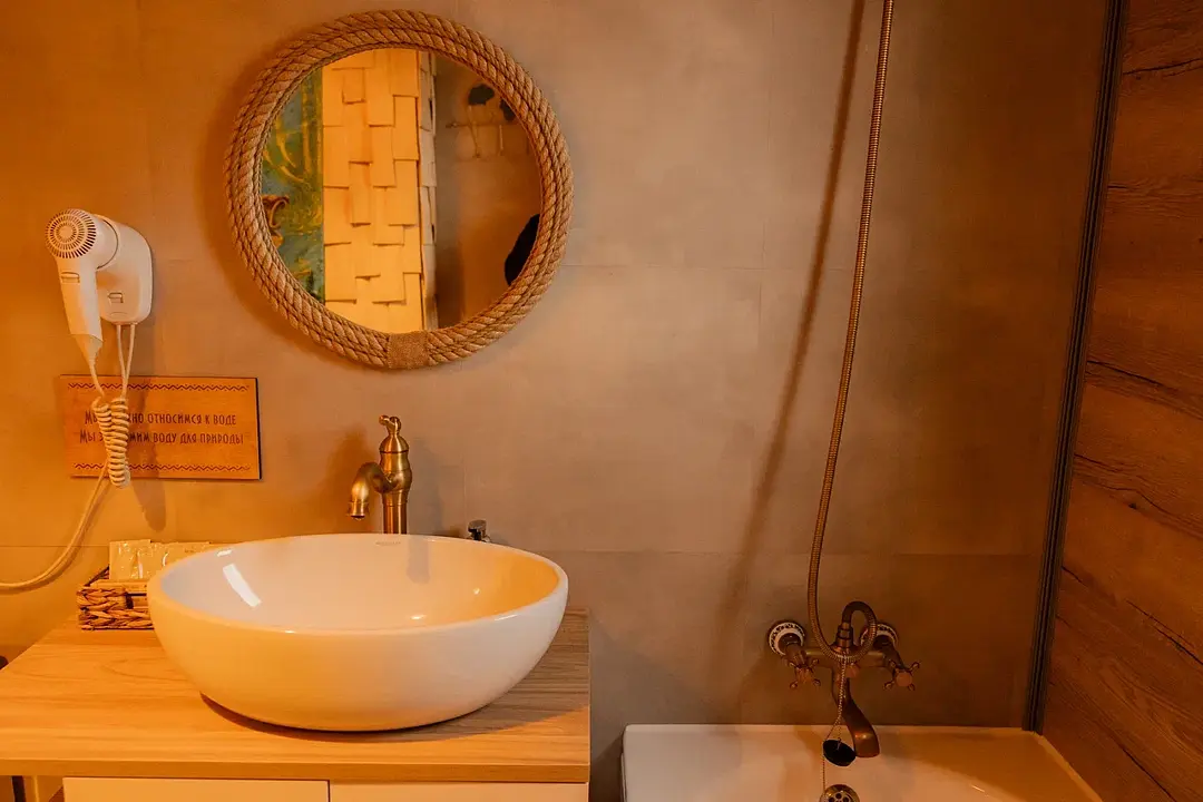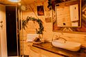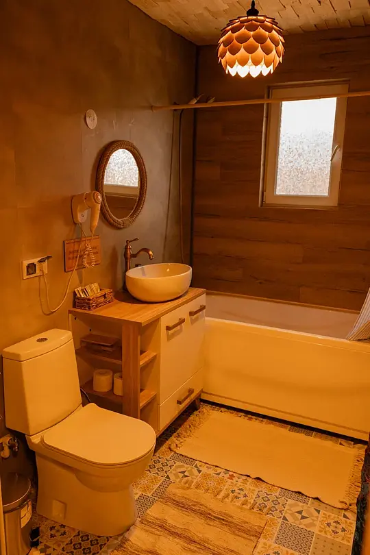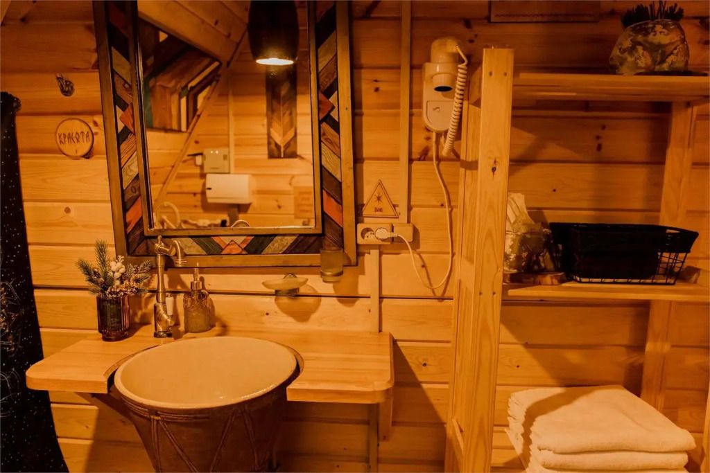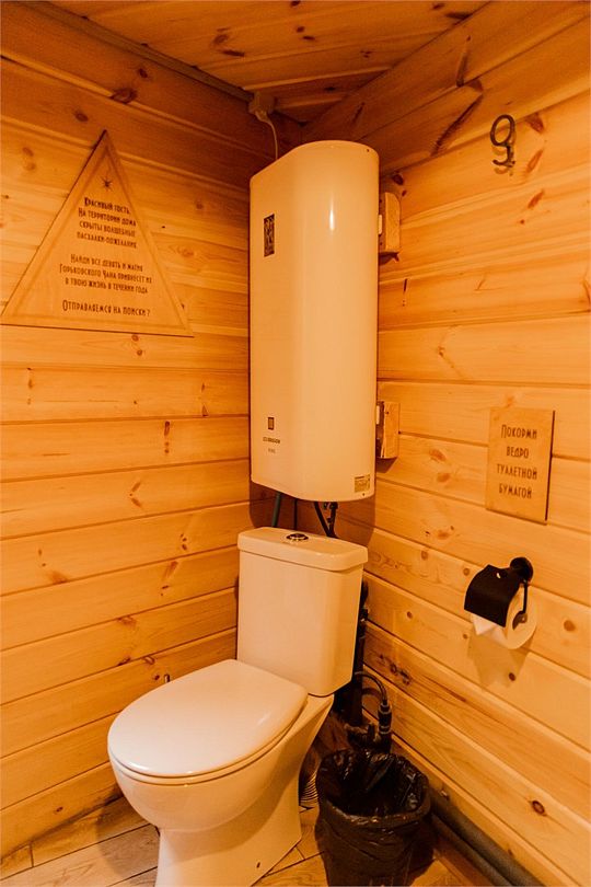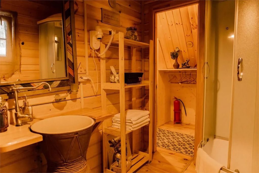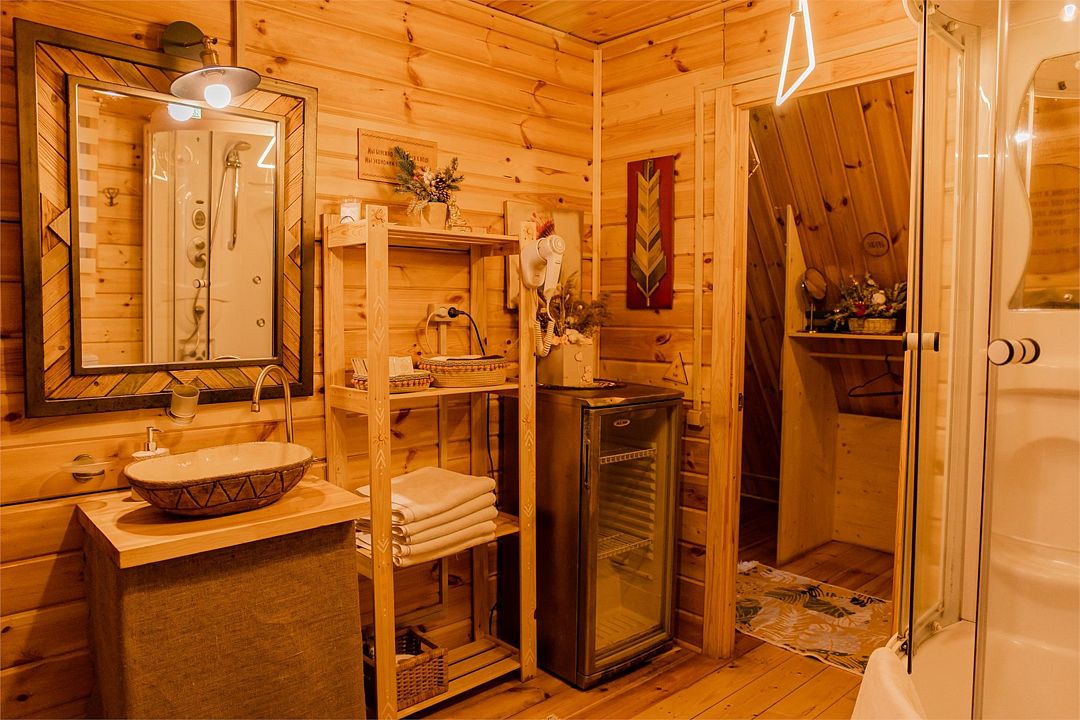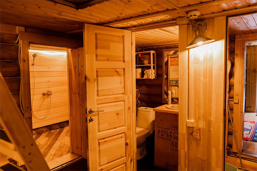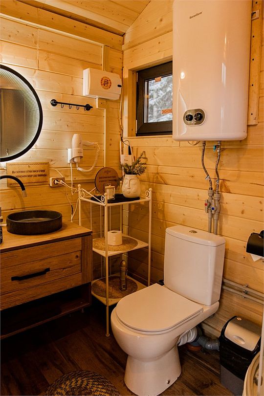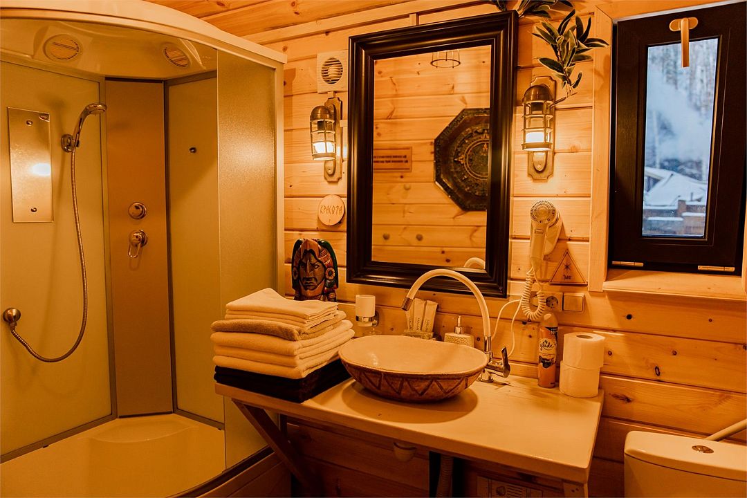 Санузел включает туалетную комнату с раковиной и отдельную душевую. Горячая вода подаётся от бойлера. Гостям предоставляются одноразовые предметы личной гигиены: зубной набор, шампунь, тапочки, полотенца для рук и тела.