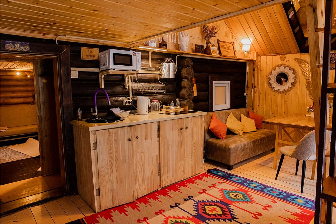 Домик с чаном. 2-6 спальных мест : 2 двухспальные кровати и двухспальный диван. Дом имеет 2 раздельные спальные комнаты и гостиную с кухней. Отапливается теплым полом и электрическими обогревателями. Кухня оборудована: холодильник, микроволновка, плита, посуда для приготовления еды, столовые приборы, стол. Ванная комната имеет: Ванная, туалет. Одноразовые предметы личной гигиены: тапочки, зубной набор, гель для душа, полотенце для рук и тела. Территория Дома: безлимитный чан (топит чанный мастер), запас дров, очаг, крытая мангальная зона: мангал-олень