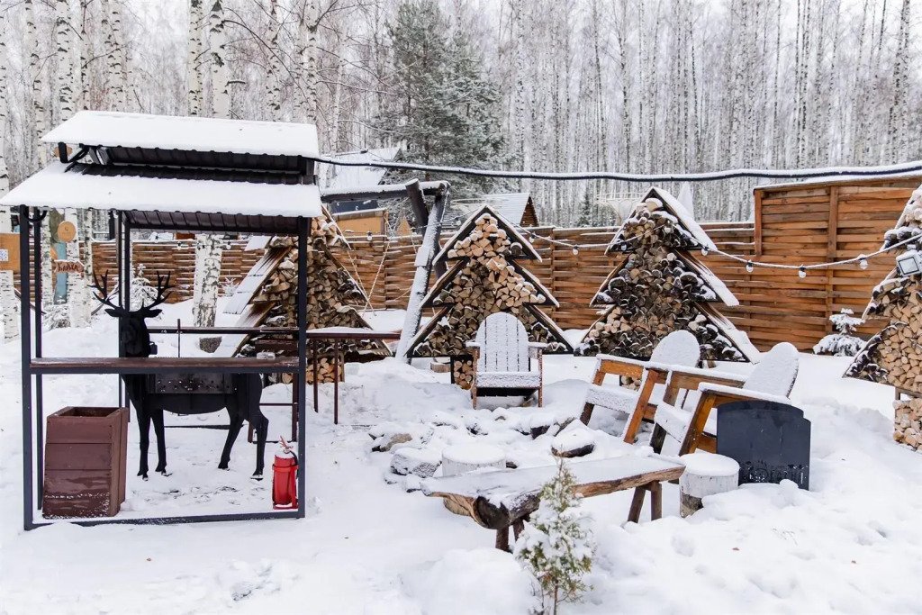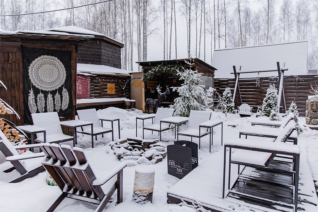 Приватная территория включает безлимитный чан (растапливает чанный мастер), закрытый двор, зону для костра, крытый мангал-олень, атмосферные фотозоны, тотемы и сказочное освещение.