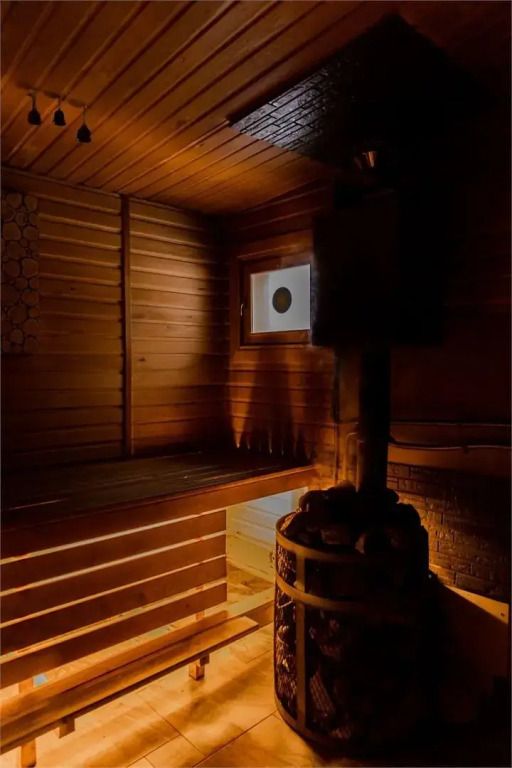 Отапливается обогревателями, теплым полом и каминной печью.