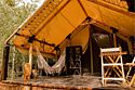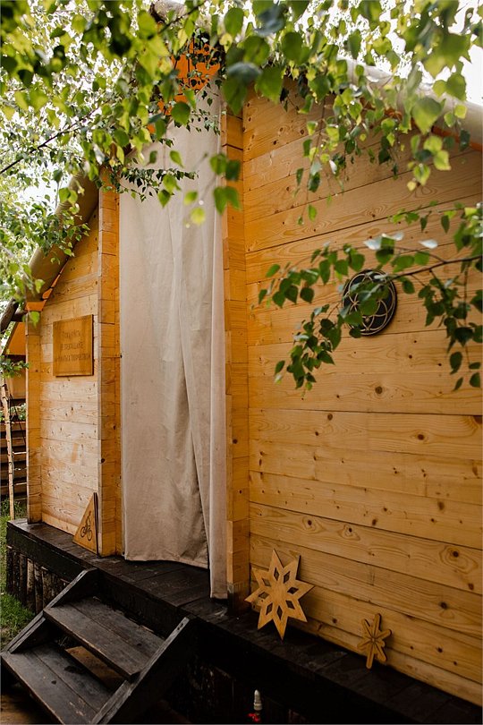 Территория сафари-тента приватная: собственный двор, безлимитный чан с запасом дров (растапливает чанный мастер), качели, очаг для костра и отдельная мангальная зона.