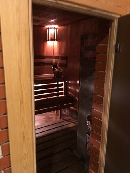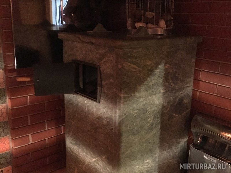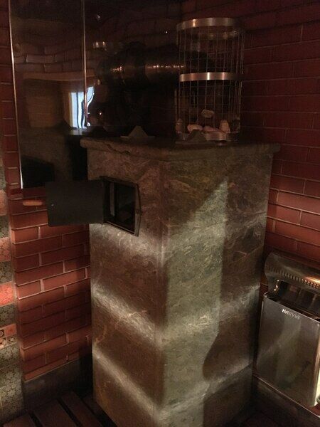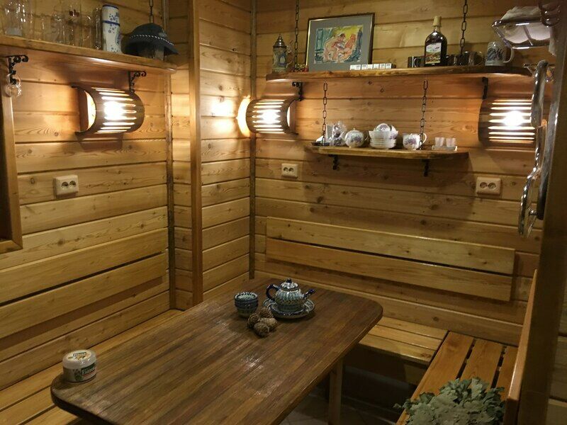Чугунная печь бани Гефест производства РФ весит 1500 кг, обложена плитами из карельского талькохлорита. В отделке парной использована древесина сибирского кедра, ольхи, лиственницы, липы, осины, абхазского бука и даже африканского дуба абаша. Оригинальность парной придает и пространственная композиция, выполненная из керамической плитки, которая сделана вручную. Тщательно продумана вентиляционная система, обеспечивающая приток воздуха, что позволяет дольше находиться в парной. Комната для отдыха - в светлой цветовой гамме, в ней комфортно побеседовать с друзьями за кружкой пива. Душевая оборудована гидромассажным устройством, а горячую ванну можно принять с солями из Крыма. Многие после парной обливаются холодной водой из ведра или ныряют с причала в реку. Полы в помещениях приятно теплые.