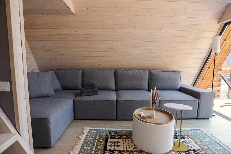 Двуспальная кровать на втором этаже и диван на первом обеспечат комфортный сон.