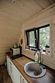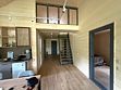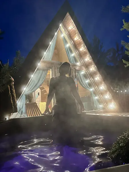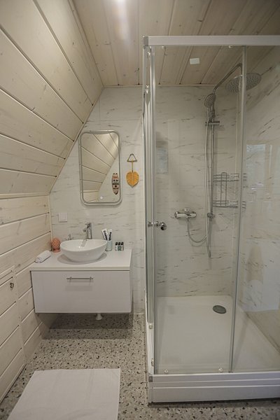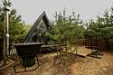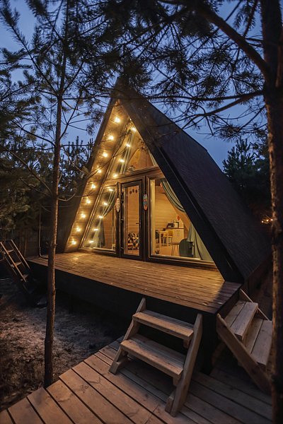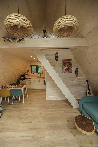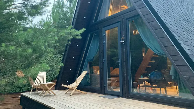 Этот дом имеет форму A-frame и приватную территорию. Интерьер выполнен в светлых тонах. Площадь дома 36 кв.м., есть второй уровень с уютным двуспальным местом, оснащенным ортопедическим матрасом.