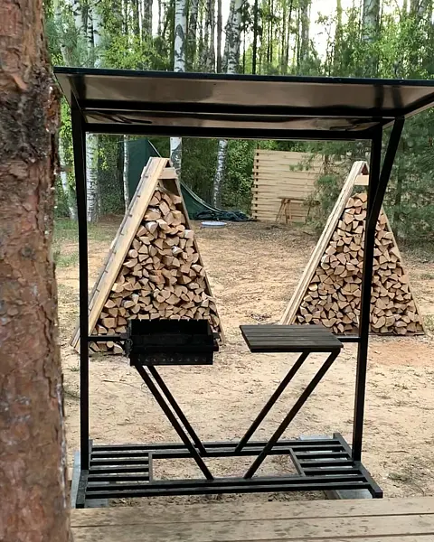 Мангальная зона с крышей и возможностью регулировать высоту шампуров или решетки над углями. Безлимитна и входит в стоимость проживания.