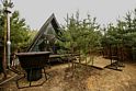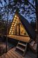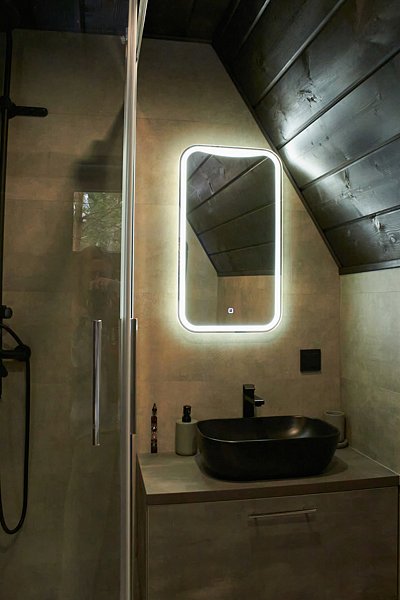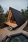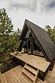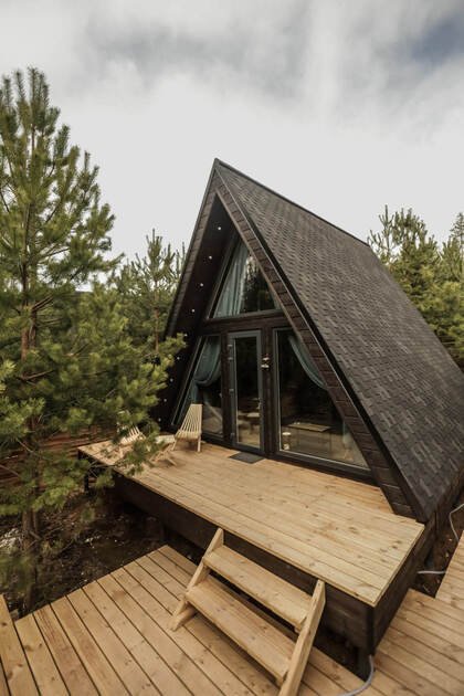 Этот дом имеет форму A-frame и выполнен в тёмных тонах. Площадь дома 36 кв.м., есть второй уровень с уютным двуспальным местом, оснащенным ортопедическим матрасом.