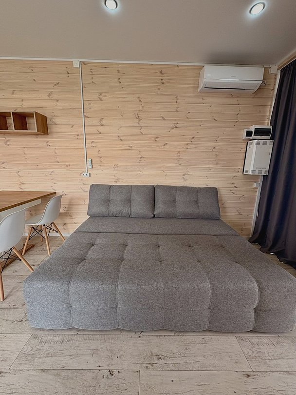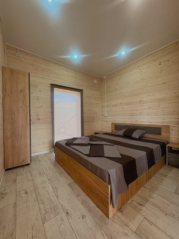 Двухкомнатный дом с большой террасой. Комнаты: спальня и кухня студия, ванная комната. Максимальная загрузка четыре гостя.