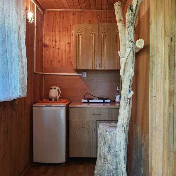 В числе удобств холодильник, плита, чайник, столовая посуда.