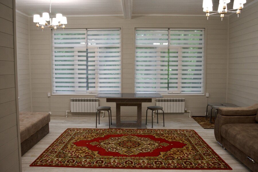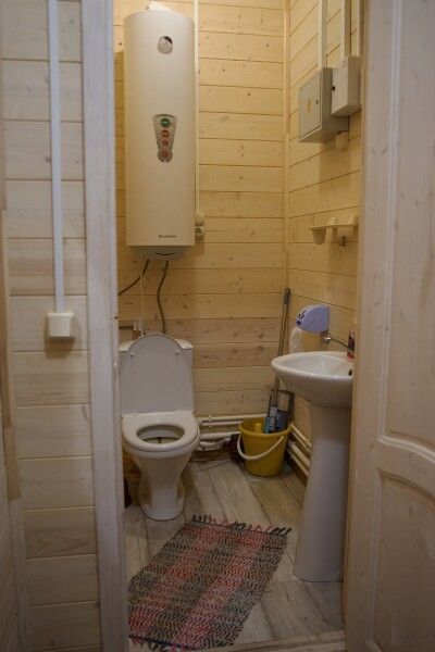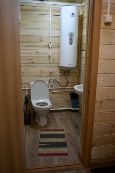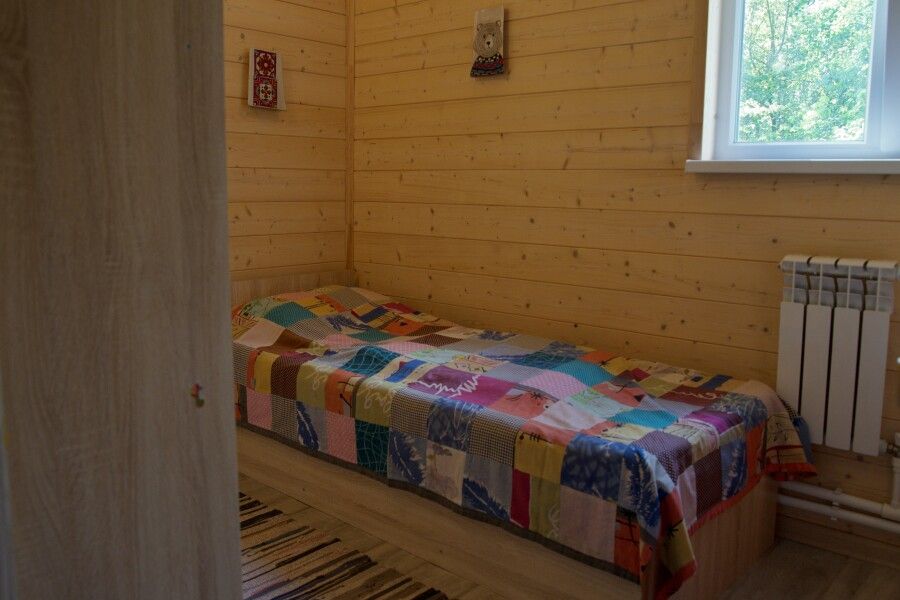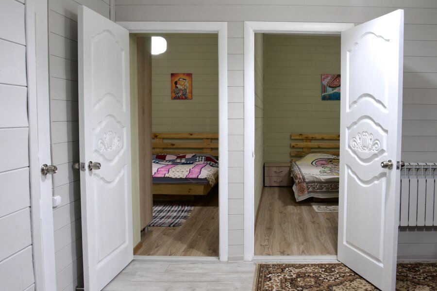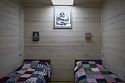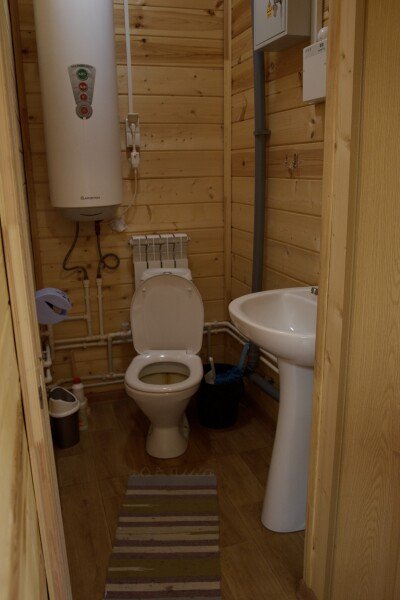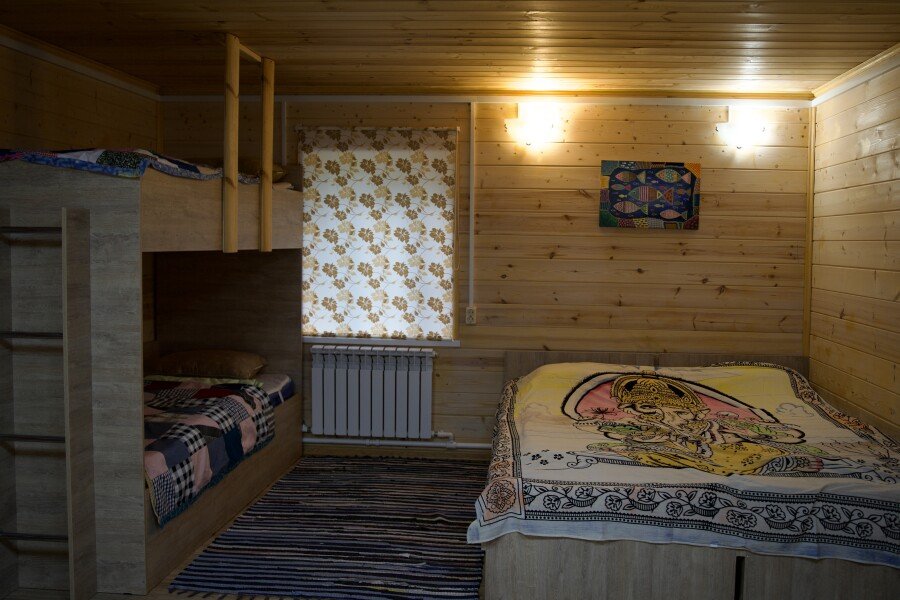 Дом на троих человек, разделен на две комнаты (на одного и на двоих человек). Одна двуспальная кровать и одна односпальная. В наличии кухня (холодильник, чайник, плитка, посуда). Предусмотрены раздельные санузел и душ.