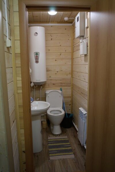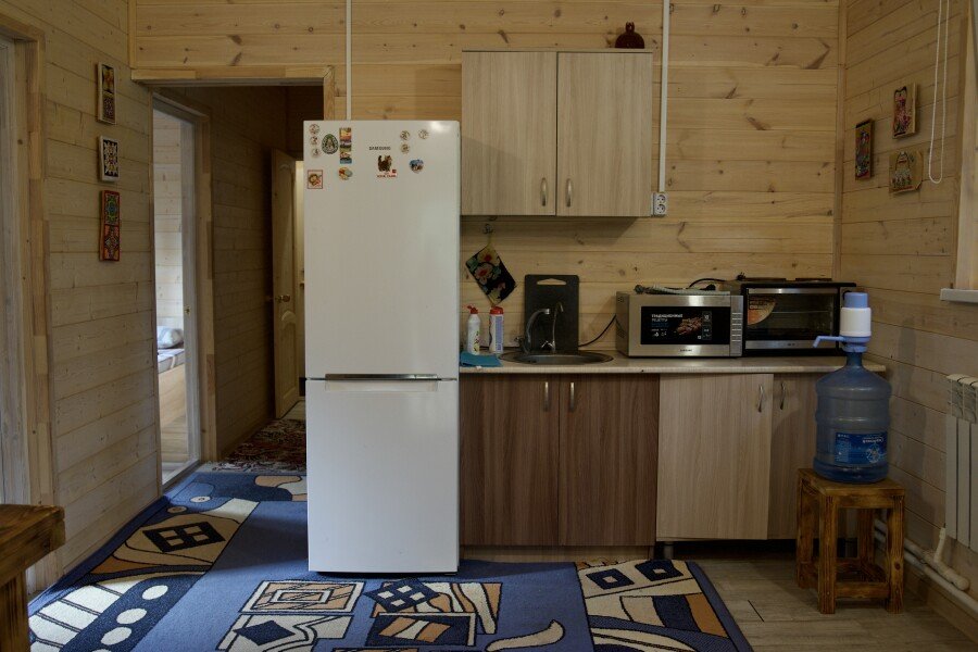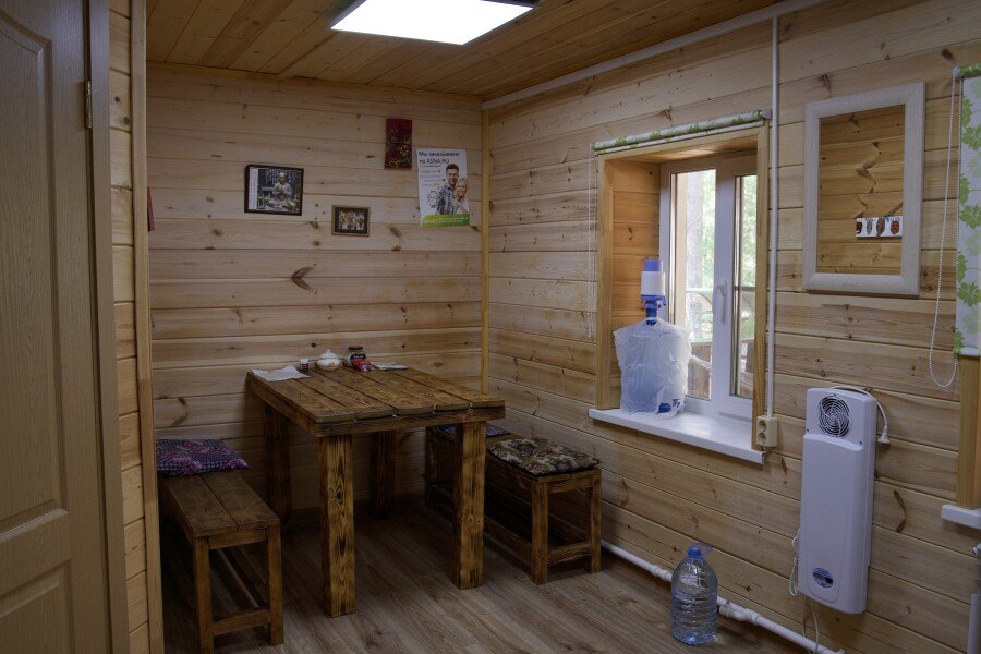Дом на две комнаты по два человека. Кухня: холодильник, чайник, духовка, плитка, посуда. Есть раздельные санузел и душ. К дому примыкает большая веранда.