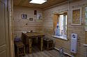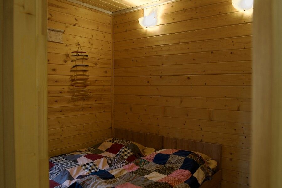 Дом для четырех человек, разделен на две комнаты. В одной — двуспальная кровать, в другой — двухъярусная. Есть кухня со всем необходимым. Имеются раздельные санузел и душ.