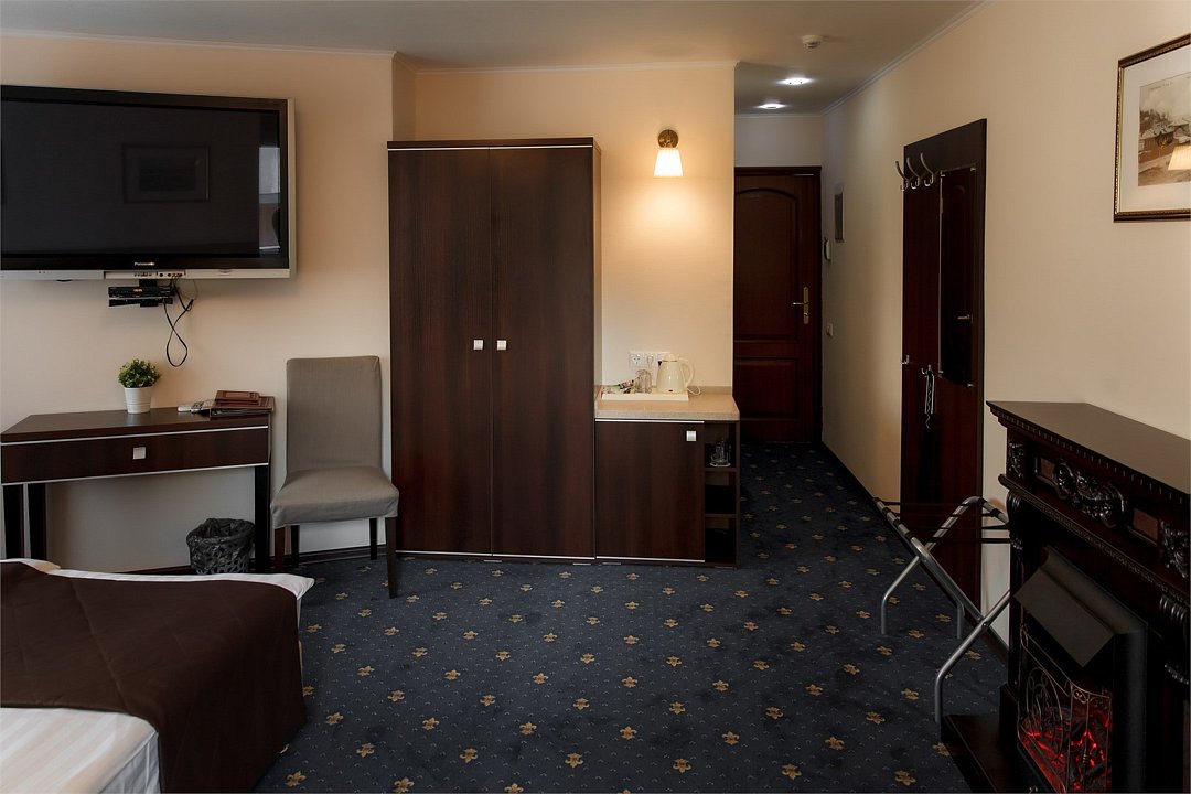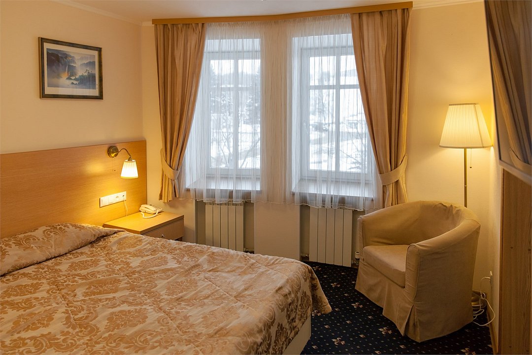 Двухместный номер для комфортного размещения семейной пары с ребёнком. Номера этой категории с лоджией, выходят на внутреннюю территорию гостиницы, один номер с камином.Услуги и удобства